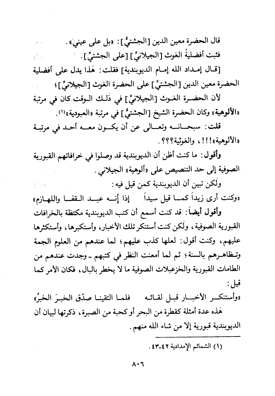 [قال إمداد الله إمام الديوبندية] فقلت: هذا يدل على أفضلية الحضرة معين الدين [الجشتيِّ] على الحضرة الغوث [الجيلانيِّ] ؛ لأن الحضرة الغوث [الجيلانيَّ] في ذلك الوقت كان في مرتبة " الألوهية " وكان الحضرة الشيخ [الجشتيّ] في مرتبة " العبودية ".