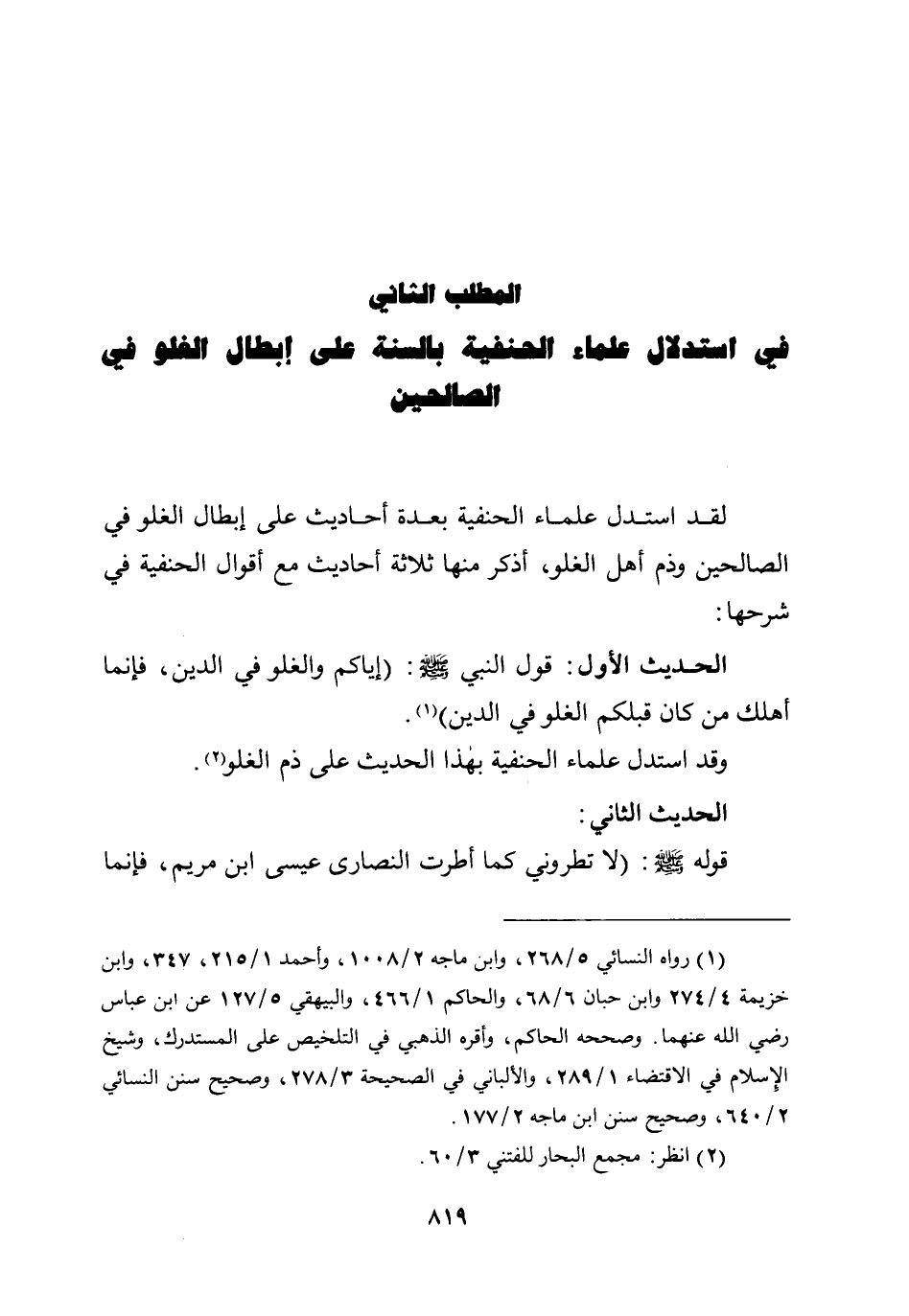 لقد استدل علماء الحنفية بعدة أحاديث على إبطال الغلو في الصالحين وذم أهل الغلو، أذكر منها ثلاثة أحاديث مع أقوال الحنفية في شرحها: