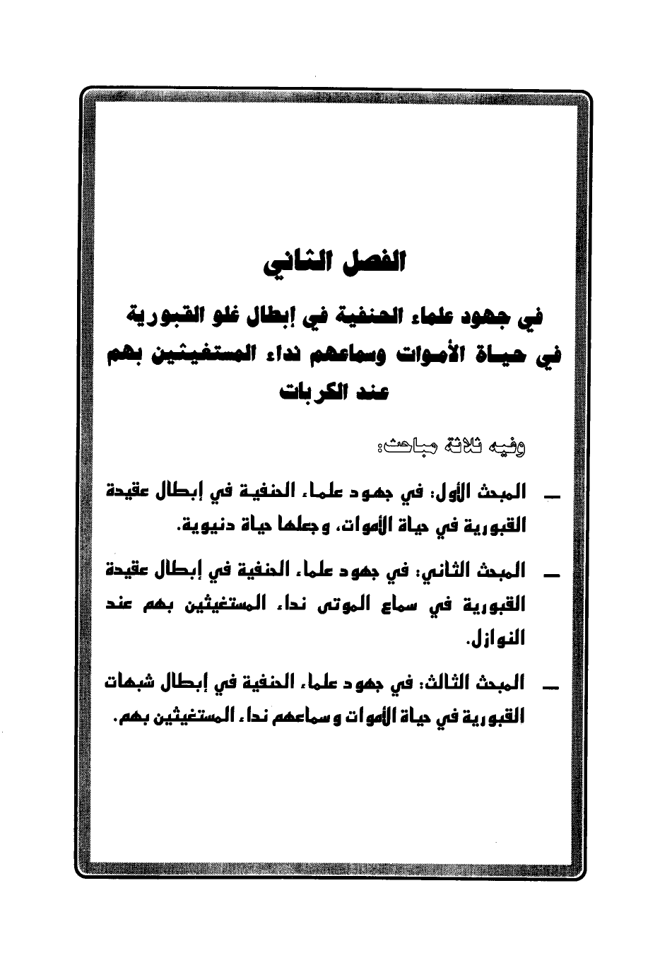 - المبحث الأول: في جهود علماء الحنفية في إبطال عقيدة القبورية في حياة الأموات، وجعلها حياة دنيوية.