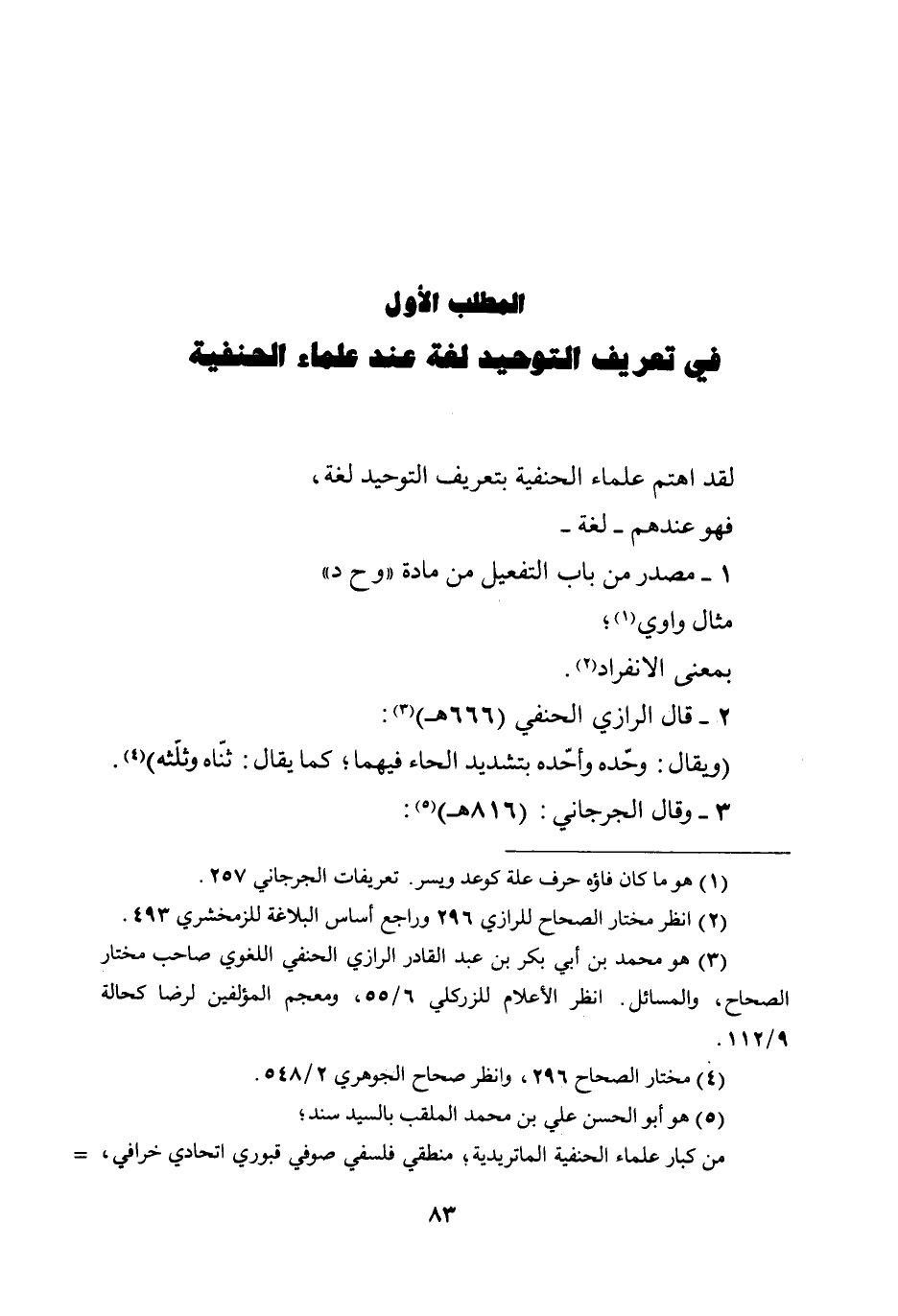 لقد اهتم علماء الحنفية بتعريف التوحيد لغة، فهو عندهم - لغة -:
