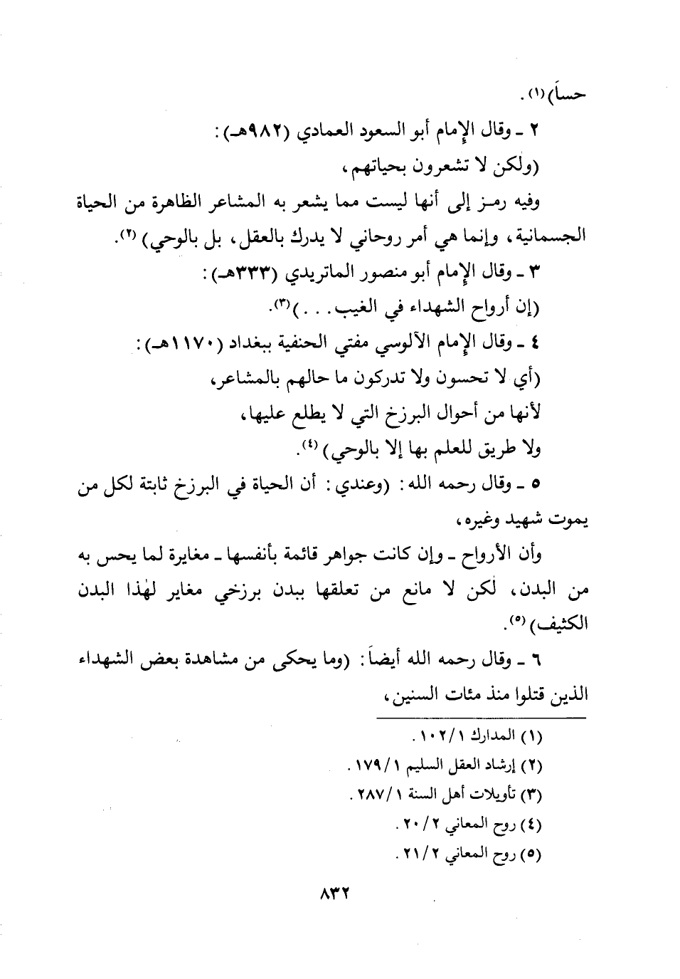 6 - وقال رحمه الله أيضا: (وما يحكى من مشاهدة بعض الشهداء الذين قتلوا منذ مئات السنين،