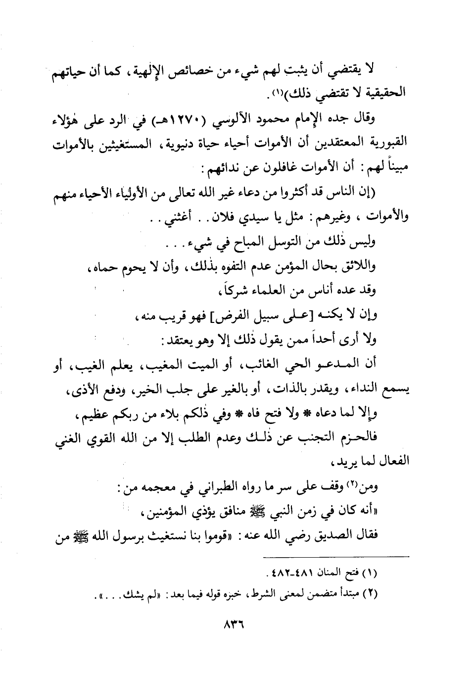 وقال جده الإمام محمود الآلوسي (1270هـ) في الرد على هؤلاء القبورية المعتقدين أن الأموات أحياء حياة دنيوية، المستغيثين بالأموات مبينا لهم: أن الأموات غافلون عن ندائهم: