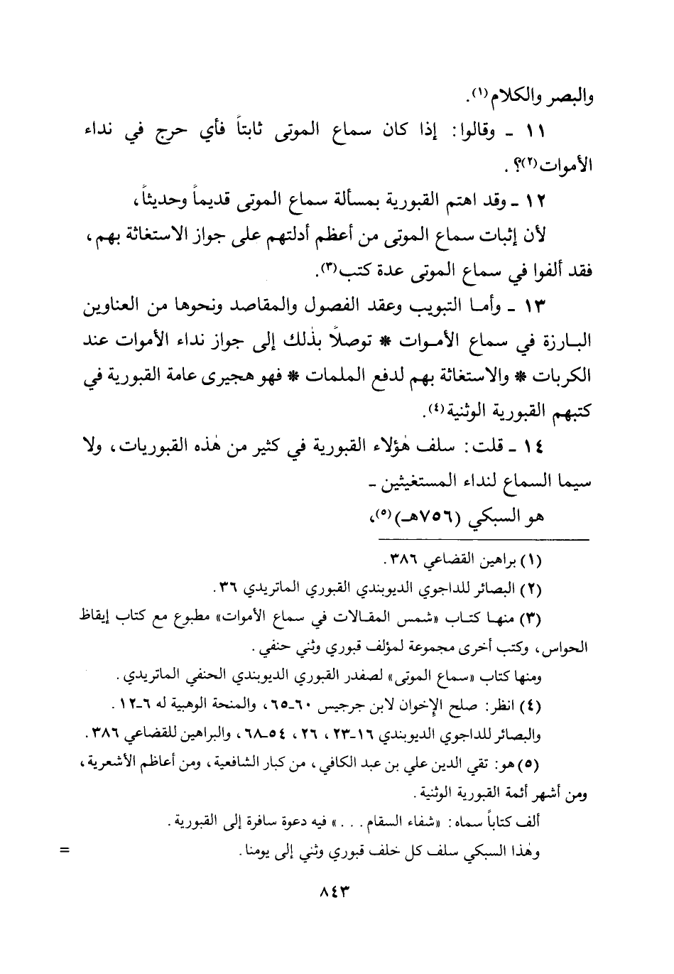 12 - وقد اهتم القبورية بمسألة سماع الموتى قديما وحديثا، لأن إثبات سماع الموتى من أعظم أدلتهم على جواز الاستغاثة بهم، فقد ألفوا في سماع الموتى عدة كتب.