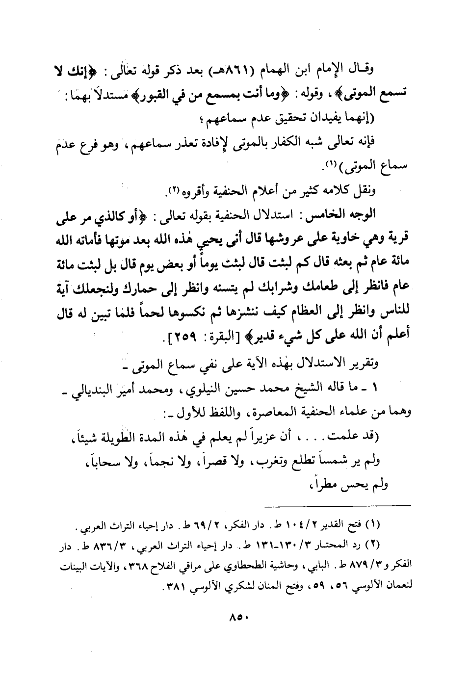 وقال الإمام ابن الهمام (861هـ) بعد ذكر قوله تعالى: {إِنَّكَ لَا تُسْمِعُ الْمَوْتَى} ، وقوله: {وَمَا أَنْتَ بِمُسْمِعٍ مَنْ فِي الْقُبُورِ} مستدلا بهما: (إنهما يفيدان تحقيق عدم سماعهم؛ فإنه تعالى شبه الكفار بالموتى لإفادة تعذر سماعهم، وهو فرع عدم سماع الموتى) .