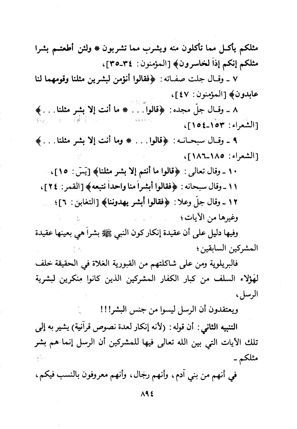 وغيرها من الآيات؛ وفيها دليل على أن عقيدة إنكار كون النبي صلى الله عليه وسلم بشرا هي بعينها عقيدة المشركين السابقين؛ فالبريلوية ومن على شاكلتهم من القبورية الغلاة في الحقيقة خلف لهؤلاء السلف من كبار الكفار المشركين الذين كانوا منكرين لبشرية الرسل، ويعتقدون أن الرسل ليسوا من جنس البشر!!!