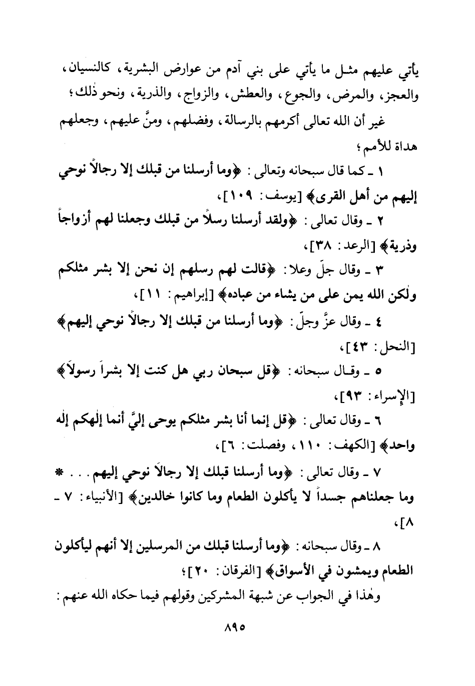 8 - وقال سبحانه: {وَمَا أَرْسَلْنَا قَبْلَكَ مِنَ الْمُرْسَلِينَ إِلَّا إِنَّهُمْ لَيَأْكُلُونَ الطَّعَامَ وَيَمْشُونَ فِي الْأَسْوَاقِ} [الفرقان: 20] ؛