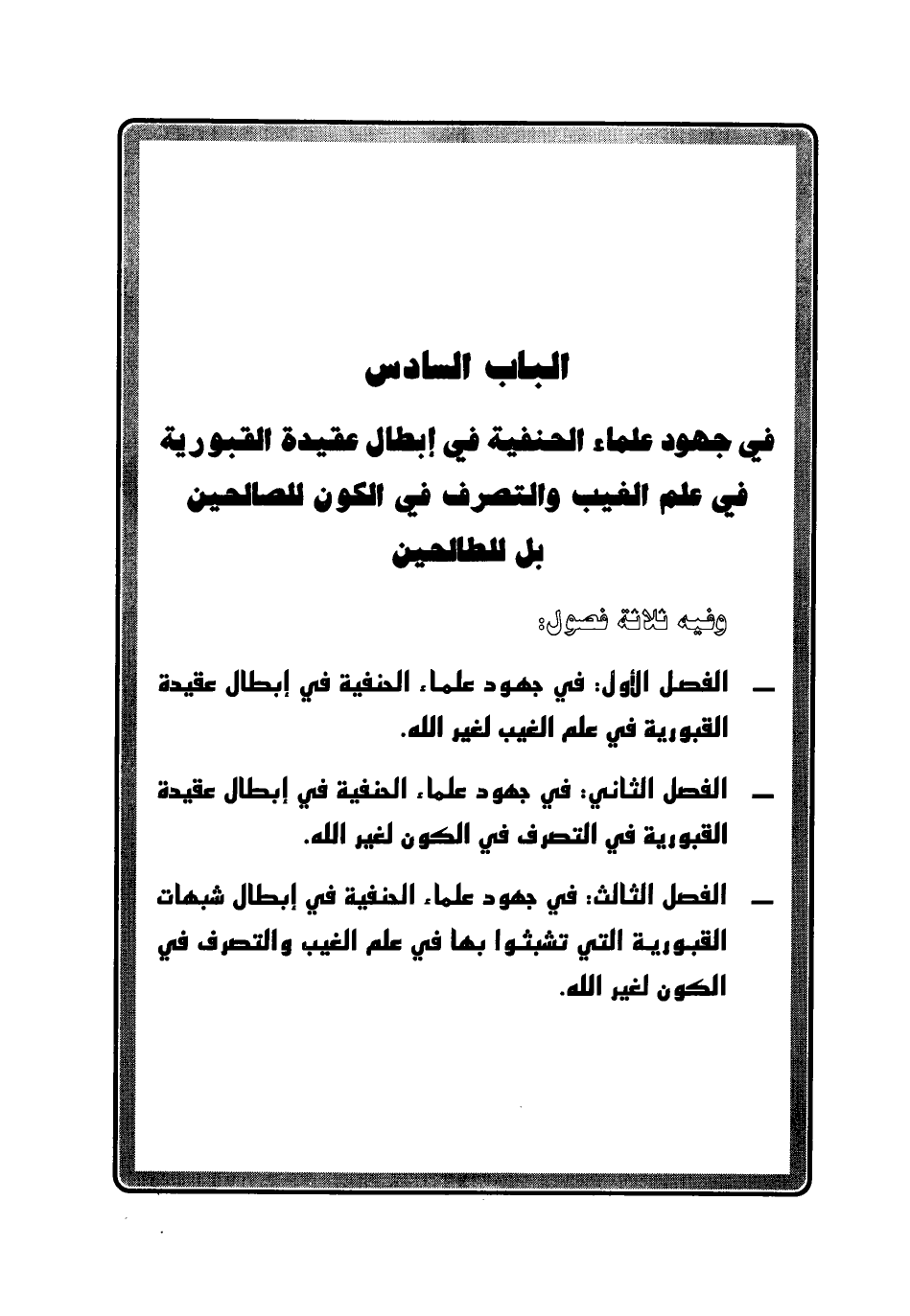 - الفصل الثالث: في جهود علماء الحنفية في إبطال شبهات القبورية التي تشبثوا بها في علم الغيب والتصرف في الكون لغير الله.