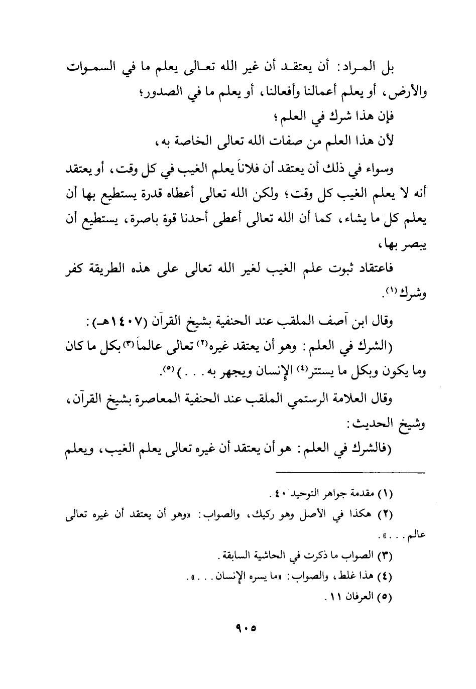 (الشرك في العلم: وهو أن يعتقد غيره تعالى عالما بكل ما كان وما يكون وبكل ما يستتر الإنسان ويجهر به ... ) .