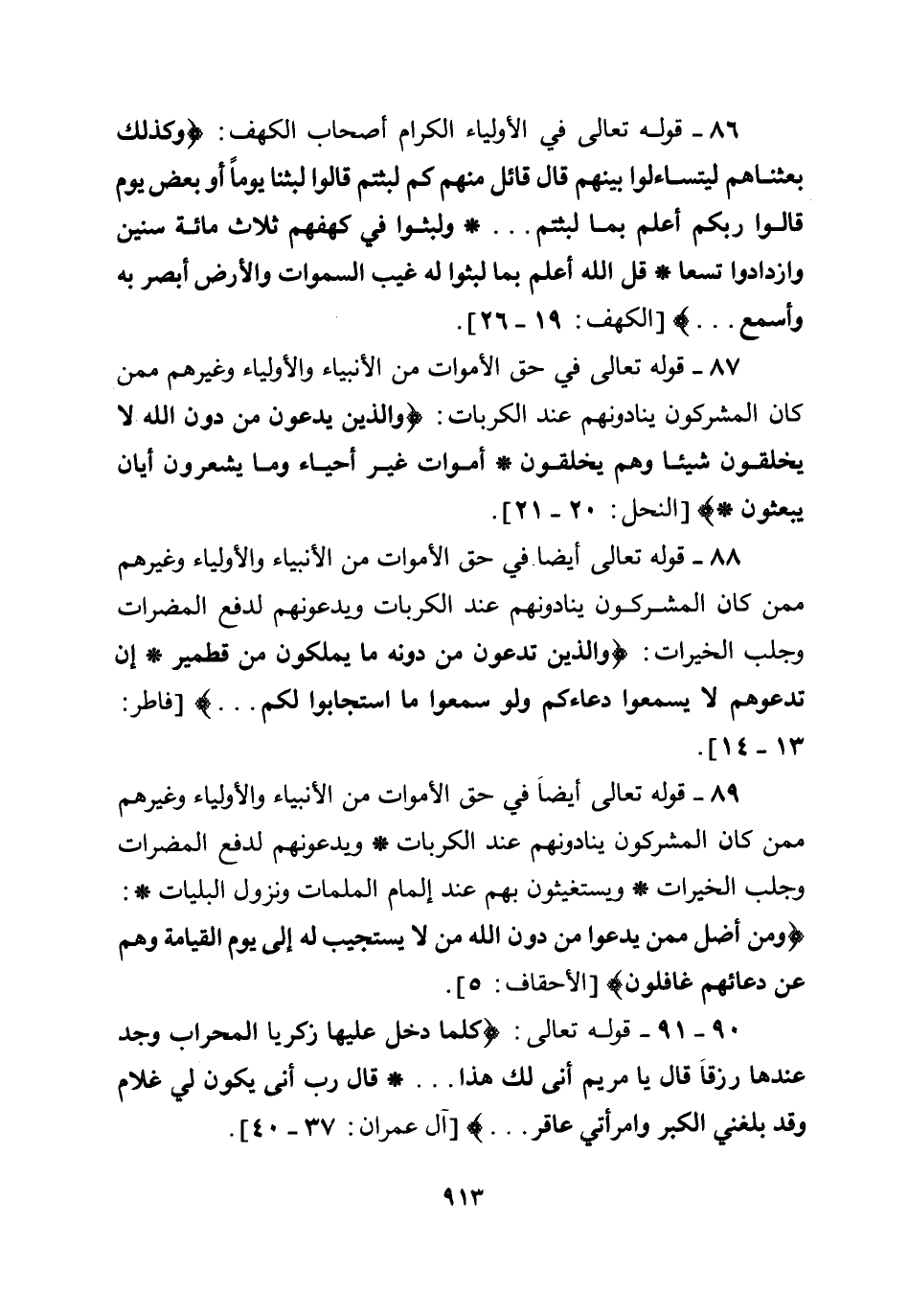 87 - قوله تعالى في حق الأموات من الأنبياء والأولياء وغيرهم ممن كان المشركون ينادونهم عند الكربات: {وَالَّذِينَ يَدْعُونَ مِنْ دُونِ اللَّهِ لَا يَخْلُقُونَ شَيْئًا وَهُمْ يُخْلَقُونَ أَمْوَاتٌ غَيْرُ أَحْيَاءٍ وَمَا يَشْعُرُونَ أَيَّانَ يُبْعَثُونَ} [النحل: 20- 21] .