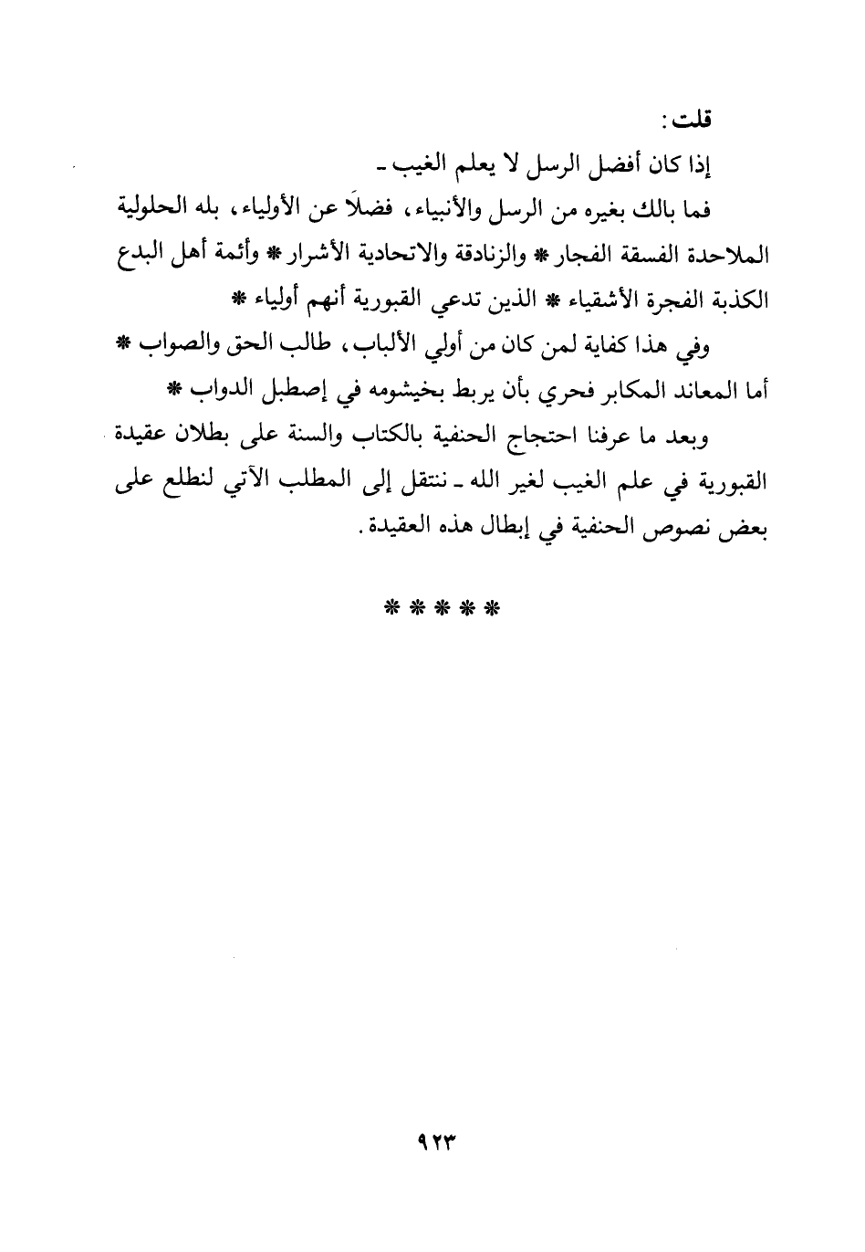 وفي هذا كفاية لمن كان من أولي الألباب، طالب الحق والصواب* أما المعاند المكابر فحري بأن يربط بخيشومه في إصطبل الدواب* وبعد ما عرفنا احتجاج الحنفية بالكتاب والسنة على بطلان عقيدة القبورية في علم الغيب لغير الله- ننتقل إلى المطلب الآتي لنطلع على بعض نصوص الحنفية في إبطال هذه العقيدة.