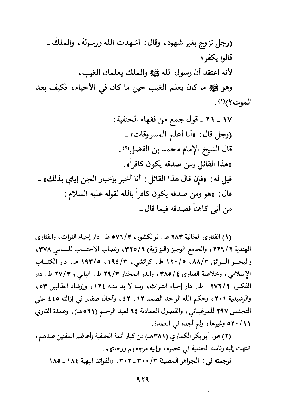 (رجل تزوج بغير شهود، وقال: أشهد الله ورسوله، والملك - قالوا يكفر؛ لأنه اعتقد أن رسول الله صلى الله عليه وسلم والملك يعلمان الغيب، وهو صلى الله عليه وسلم ما كان يعلم الغيب حين ما كان في الأحياء، فكيف بعد الموت؟) .