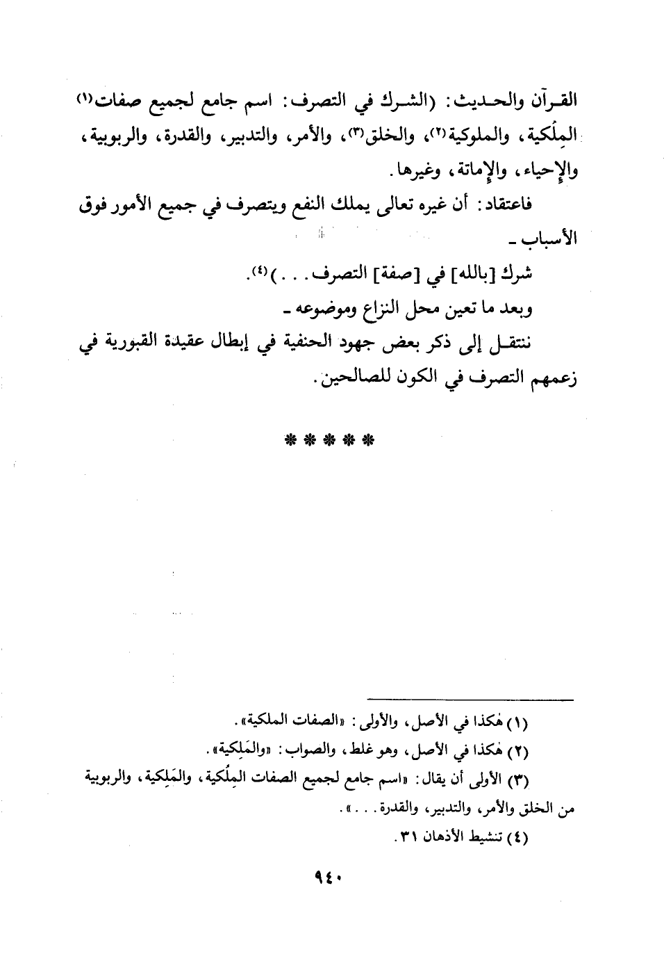 القرآن والحديث: (الشرك في التصرف: اسم جامع لجميع صفات الملكية، والملوكية، والخلق، والأمر، والتدبير، والقدرة، والربوبية، والإحياء، والإماتة، وغيرها.