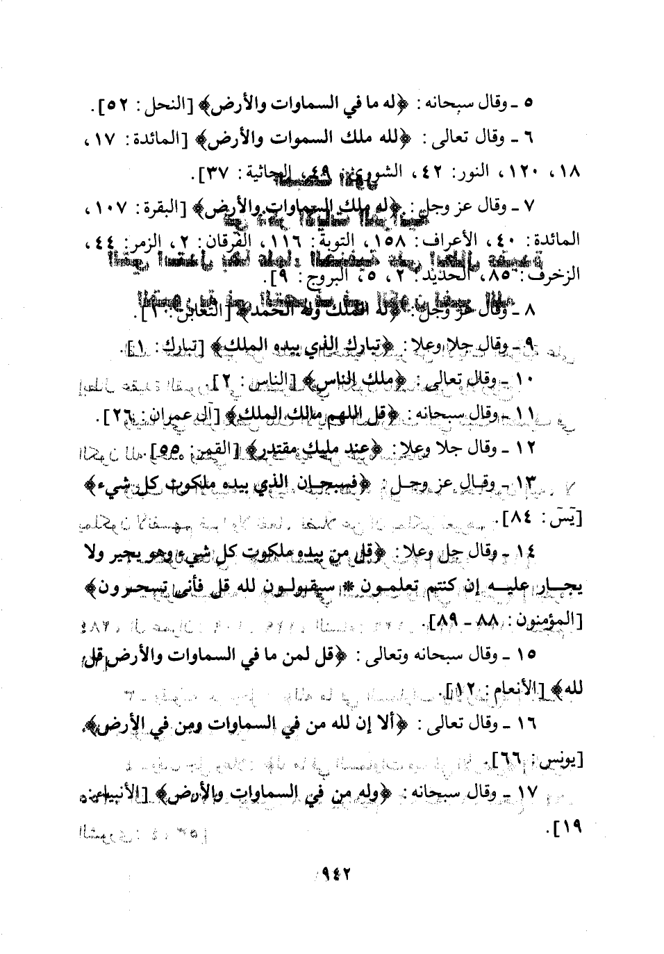 6 - وقال تعالى: {وَلِلَّهِ مُلْكُ السَّمَاوَاتِ وَالْأَرْضِ} [المائدة: 17، 18، 120، النور: 42، الشورى: 49، الجانثة: 37] .