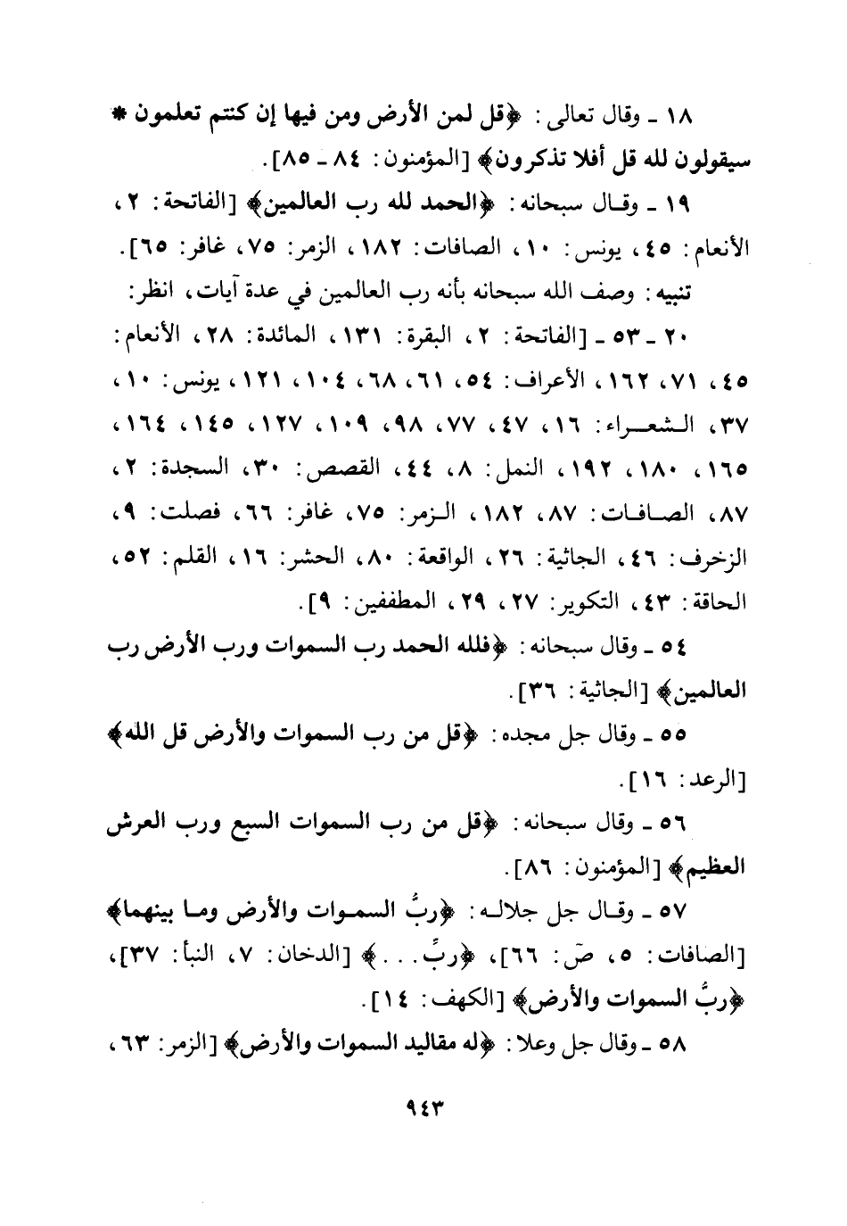 57 - وقال جل جلاله: {رَبُّ السَّمَاوَاتِ وَالْأَرْضِ وَمَا بَيْنَهُمَا} [الصافات: 5، ص: 66] ، {رَبِّ} ... [الدخان: 7، النبأ: 37] ، {رَبُّ السَّمَاوَاتِ وَالْأَرْضِ} [الكهف: 14] .