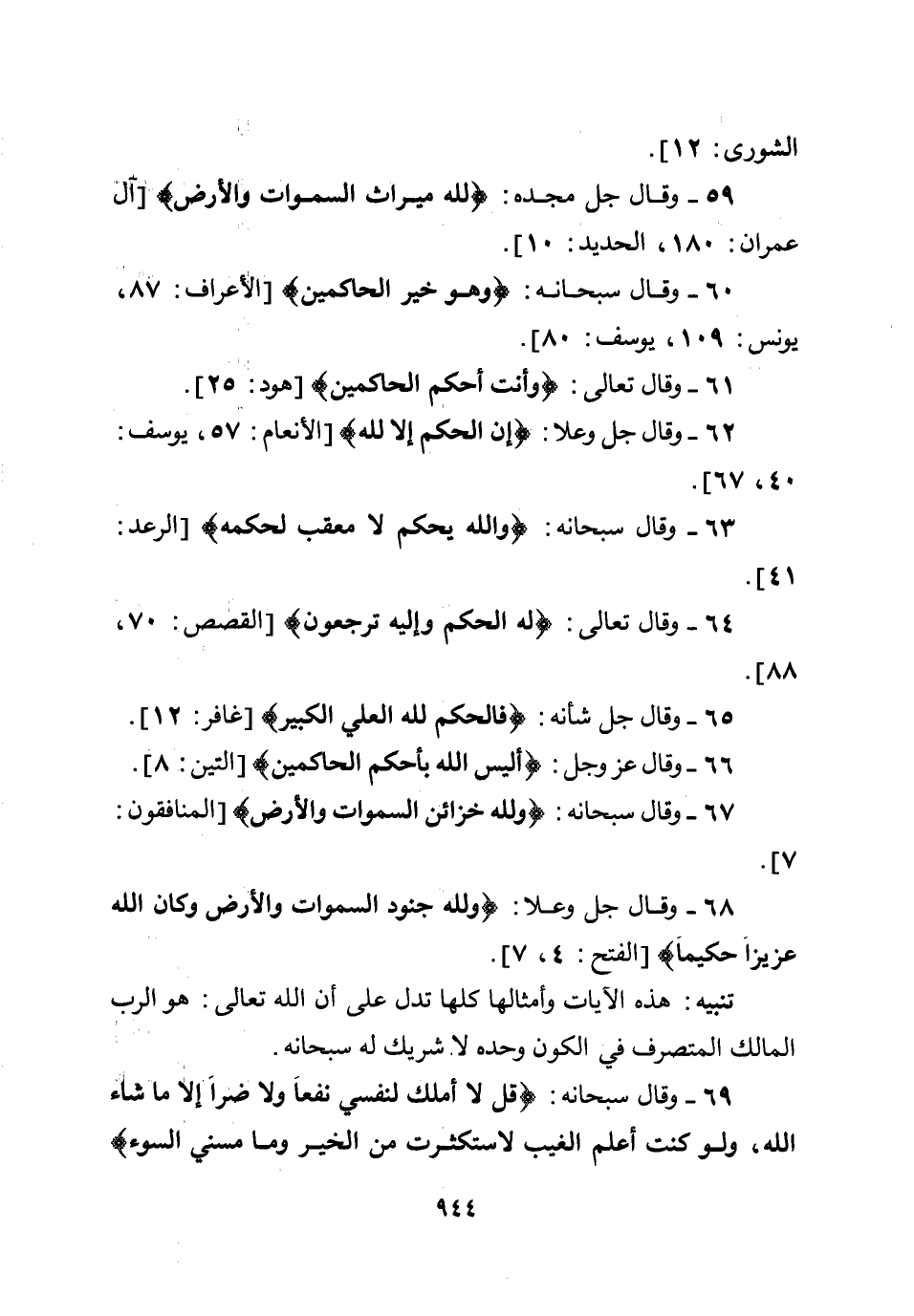 62 - وقال جل وعلا: {إِنِ الْحُكْمُ إِلَّا لِلَّهِ} [الأنعام: 57، يوسف: 40، 67] .