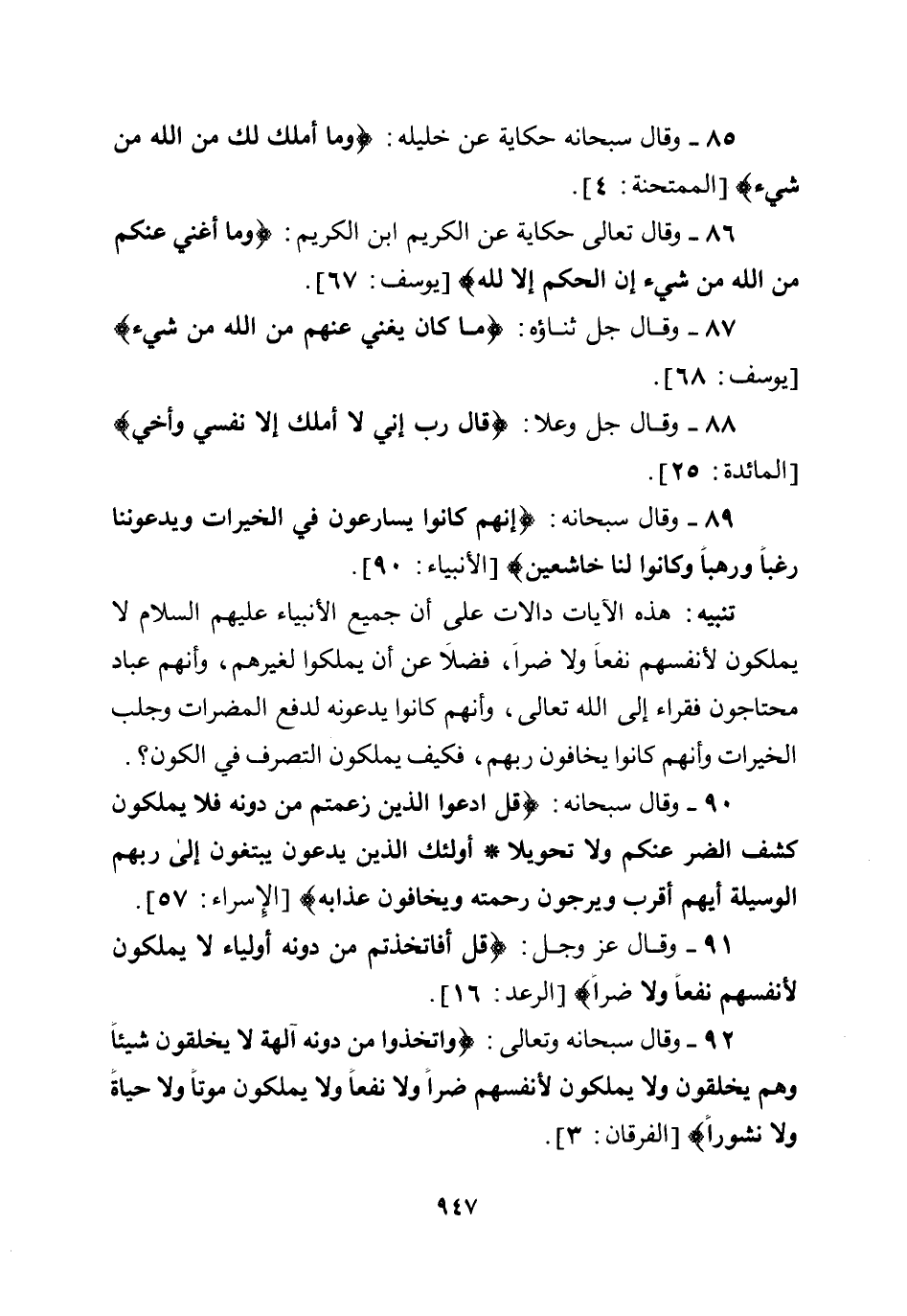 85 - وقال سبحانه حكاية عن خليله: {وَمَا أَمْلِكُ لَكَ مِنَ اللَّهِ مِنْ شَيْءٍ} [الممتحنة: 4] .