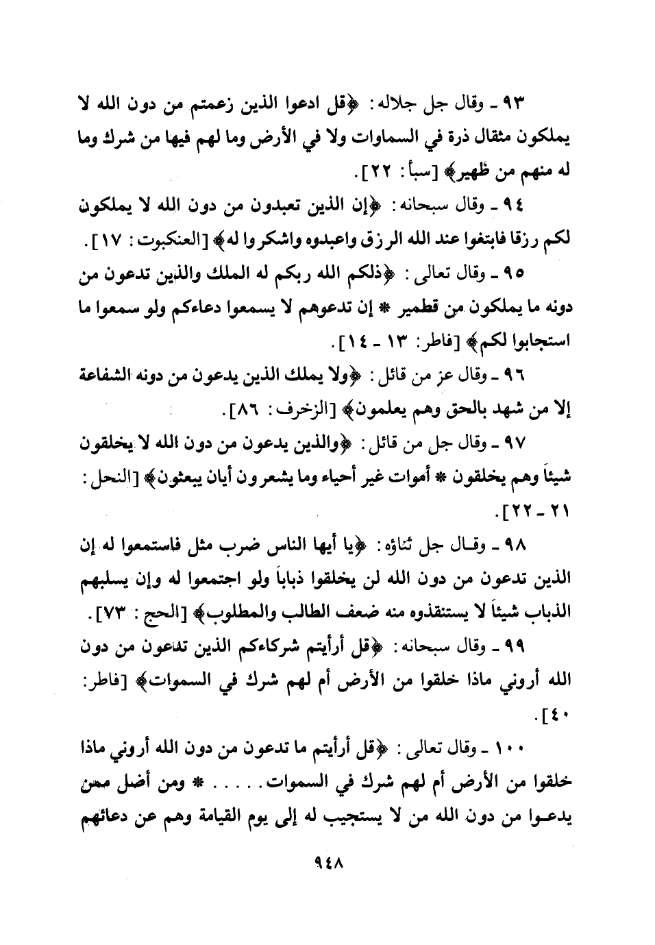 93 - وقال جل جلاله: {قُلِ ادْعُوا الَّذِينَ زَعَمْتُمْ مِنْ دُونِ اللَّهِ لَا يَمْلِكُونَ مِثْقَالَ ذَرَّةٍ فِي السَّمَاوَاتِ وَلَا فِي الْأَرْضِ وَمَا لَهُمْ فِيهِمَا مِنْ شِرْكٍ وَمَا لَهُ مِنْهُمْ مِنْ ظَهِيرٍ} [سبأ: 22] .