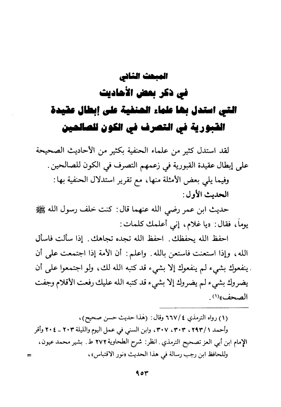 حديث ابن عمر رضي الله عنهما قال: «كنت خلف رسول الله صلى الله عليه وسلم يوما، فقال: يا غلام، إني أعلمك كلمات: احفظ الله يحفظك، احفظ الله تجده تجاهك، إذا سألت فاسأل الله، وإذا استعنت فاستعن بالله، واعلم: أن الأمة إذا اجتمعت على أن ينفعوك بشيء لم ينفعوك إلا بشيء قد كتبه الله لك، ولو اجتمعوا على أن يضروك بشيء لم يضروك إلا بشيء قد كتبه الله عليك رفعت الأقلام وجفت الصحف» ".