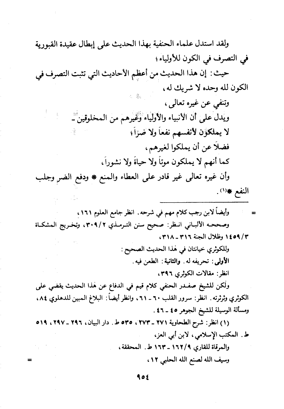 ولقد استدل علماء الحنفية بهذا الحديث على إبطال عقيدة القبورية في التصرف في الكون للأولياء؛ حيث: إن هذا الحديث من أعظم الأحاديث التي تثبت التصرف في الكون لله وحده لا شريك له، وتنفي عن غيره تعالى، ويدل على أن الأنبياء والأولياء وغيرهم من المخلوقين- لا يملكون لأنفسم نفعا ولا ضرا؛ فضلا عن أن يملكوا لغيرهم، كما أنهم لا يملكون موتا ولا حياةً ولا نشورا، وأن غيره تعالى غير قادر على العطاء والمنع * ودفع الضر وجلب النفع*