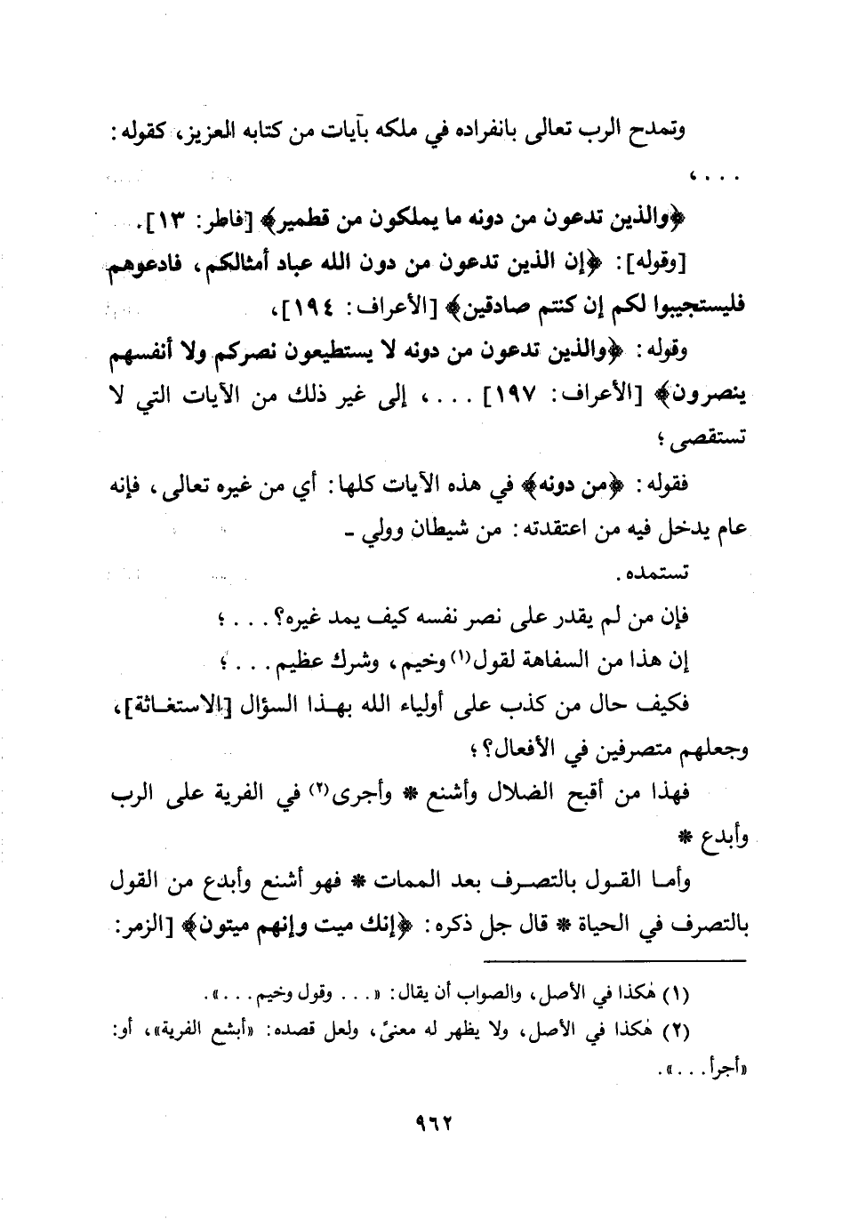 فإن من لم يقدر على نصر نفسه كيف يمد غيره؟ ... ؛ إن هذا من السفاهة لقول وخيم، وشرك عظيم..؛ فكيف حال من كذب على أولياء الله بهذا السؤال [الاستغاثة] ، وجعلهم متصرفين في الأفعال؟؛ فهذا من أقبح الضلال وأشنع * وأجرى في الفرية على الرب وأبدع* وأما القول بالتصرف بعد الممات * فهو أشنع وأبدع من القول بالتصرف في الحياة * قال جل ذكره: {إِنَّكَ مَيِّتٌ وَإِنَّهُمْ مَيِّتُونَ} [الزمر: