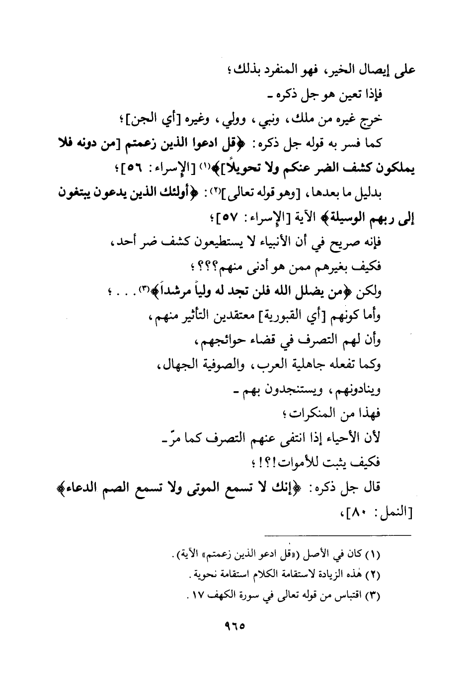 بدليل ما بعدها، [وهو قوله تعالى] : {أُولَئِكَ الَّذِينَ يَدْعُونَ يَبْتَغُونَ إِلَى رَبِّهِمُ الْوَسِيلَةَ} الآية [الإسراء: 57] ؛ فإنه صريح في أن الأنبياء لا يستطيعون كشف ضر أحد، فكيف بغيرهم ممن هو أدنى منهم؟؟؟؛ ولكن {وَمَنْ يُضْلِلْ فَلَنْ تَجِدَ لَهُ وَلِيًّا مُرْشِدًا} ... ؛ وأما كونهم [أي القبورية] معتقدين التأثير منهم، وأن لهم التصرف في قضاء حوائجهم، وكما تفعله جاهلية العرب، والصوفية الجهال، وينادونهم، ويستنجدون بهم- فهذا من المنكرات؛ لأن الأحياء إذا انتفى عنهم التصرف كما مرّ- فكيف يثبت للأموات!؟!؛ قال جل ذكره: {إِنَّكَ لَا تُسْمِعُ الْمَوْتَى وَلَا تُسْمِعُ الصُّمَّ الدُّعَاءَ} [النمل: 80] ،