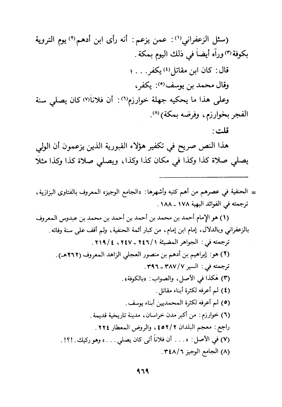 قلت: هذا النص صريح في تكفير هؤلاء القبورية الذين يزعمون أن الولي يصلي صلاة كذا وكذا في مكان كذا وكذا، ويصلي صلاة كذا وكذا مثلا