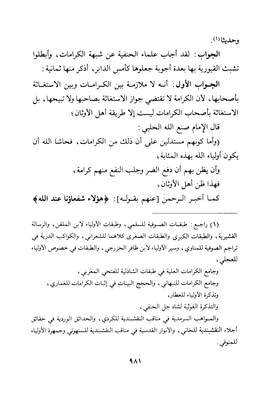 الجواب الأول: أنه لا ملازمة بين الكرامات وبين الاستغاثة بأصحابها، لأن الكرامة لا تقتضي جواز الاستغاثة بصاحبها ولا تبيحها، بل الاستغاثة بأصحاب الكرامات ليست إلا طريقة أهل الأوثان؛ قال الإمام صنع الله الحلبي: