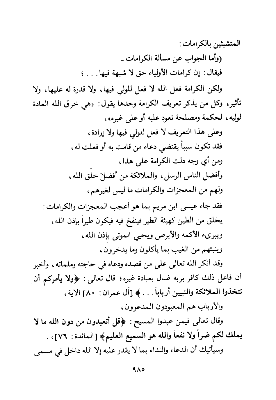 يخلق من الطين كهيئة الطير فينفخ فيه فيكون طيرا بإذن الله، ويبرئ الأكمه والأبرص ويحيي الموتى بإذن الله، وينبئهم من الغيب بما يأكلون وما يدخرون، وقد أنكر الله تعالى على من قصده ودعاه في حاجته وملماته، وأخبر أن فاعل ذلك كافر بربه ضال بعبادة غيره؛ قال تعالى: {وَلَا يَأْمُرَكُمْ أَنْ تَتَّخِذُوا الْمَلَائِكَةَ وَالنَّبِيِّينَ أَرْبَابًا} ... [آل عمران: 80] الآية، والأرباب هم المعبودون المدعوون، وقال تعالى فيمن عبدوا المسيح: {قُلْ أَتَعْبُدُونَ مِنْ دُونِ اللَّهِ مَا لَا يَمْلِكُ لَكُمْ ضَرًّا وَلَا نَفْعًا وَاللَّهُ هُوَ السَّمِيعُ الْعَلِيمُ} [المائدة: 76] ،.