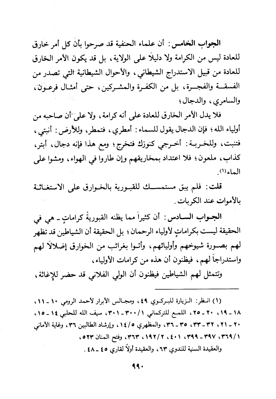 الجواب الخامس: أن علماء الحنفية قد صرحوا بأن كل أمر خارق للعادة ليس من الكرامة ولا دليلا على الولاية، بل قد يكون الأمر الخارق للعادة من قبيل الاستدراج الشيطاني، والأحوال الشيطانية التي تصدر من الفسقة والفجرة، بل من الكفرة والمشركين، حتى أمثال فرعون، والسامري، والدجال؛ فلا يدل الأمر الخارق للعادة على أنه كرامة، ولا على أن صاحبه من أولياء الله؛ فإن الدجال يقول للسماء: أمطري، فتمطر، وللأرض: أنبتي، فتنب، وللخربة: أخرجي كنزك فتخرج؛ ومع هذا فإنه دجال، أبتر، كذاب، ملعون؛ فلا اعتداد بمخاريقهم وإن طاروا في الهواء، ومشوا على الماء.