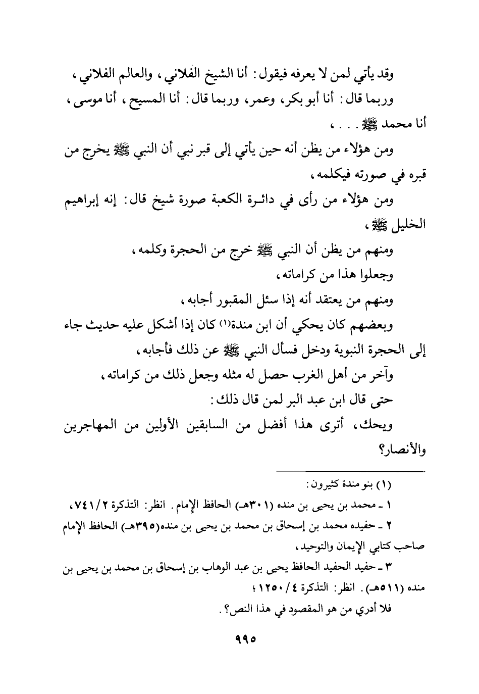 وقد يأتي لمن لا يعرفه فيقول: أنا الشيخ الفلاني، والعالم الفلاني، وربما قال: أنا أبو بكر، وعمر، وربما قال: أنا المسيح، أنا موسى، أنا محمد صلى الله عليه وسلم ... ، ومن هؤلاء من يظن أنه حين يأتي إلى قبر نبي أن النبي صلى الله عليه وسلم يخرج من قبره في صورته فيكلمه، ومن هؤلاء من رأى في دائرة الكعبة صورة شيخ قال: إنه إبراهيم الخليل صلى الله عليه وسلم، ومنهم من يظن أن النبي صلى الله عليه وسلم خرج من الحجرة وكلمه، وجعلوا هذا من كراماته، ومنهم من يعتقد أنه إذا سئل المقبور أجابه، وبعضهم كان يحكي أن ابن منده كان إذا أشكل عليه حديث جاء إلى الحجرة النبوية ودخل فسأل النبي صلى الله عليه وسلم عن ذلك فأجابه، وآخر من أهل الغرب حصل له مثله وجعل ذلك من كراماته، حتى قال ابن عبد البر لمن قال ذلك: