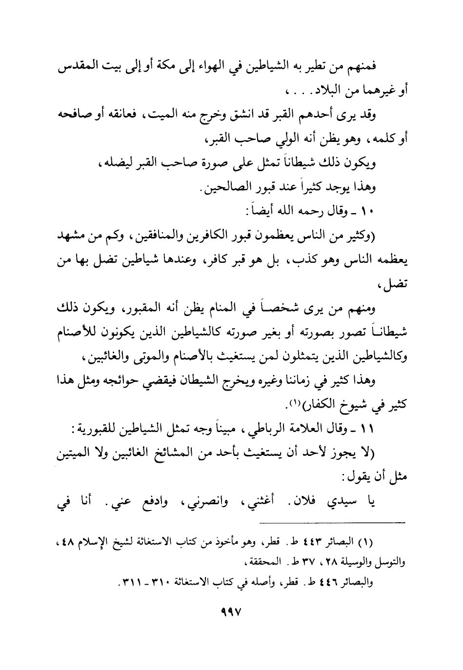 (لا يجوز لأحد أن يستغيث بأحد من المشائخ الغائبين ولا الميتين مثل أن يقول: يا سيدي فلان. أغثني، وانصرني، وادفع عني. أنا في