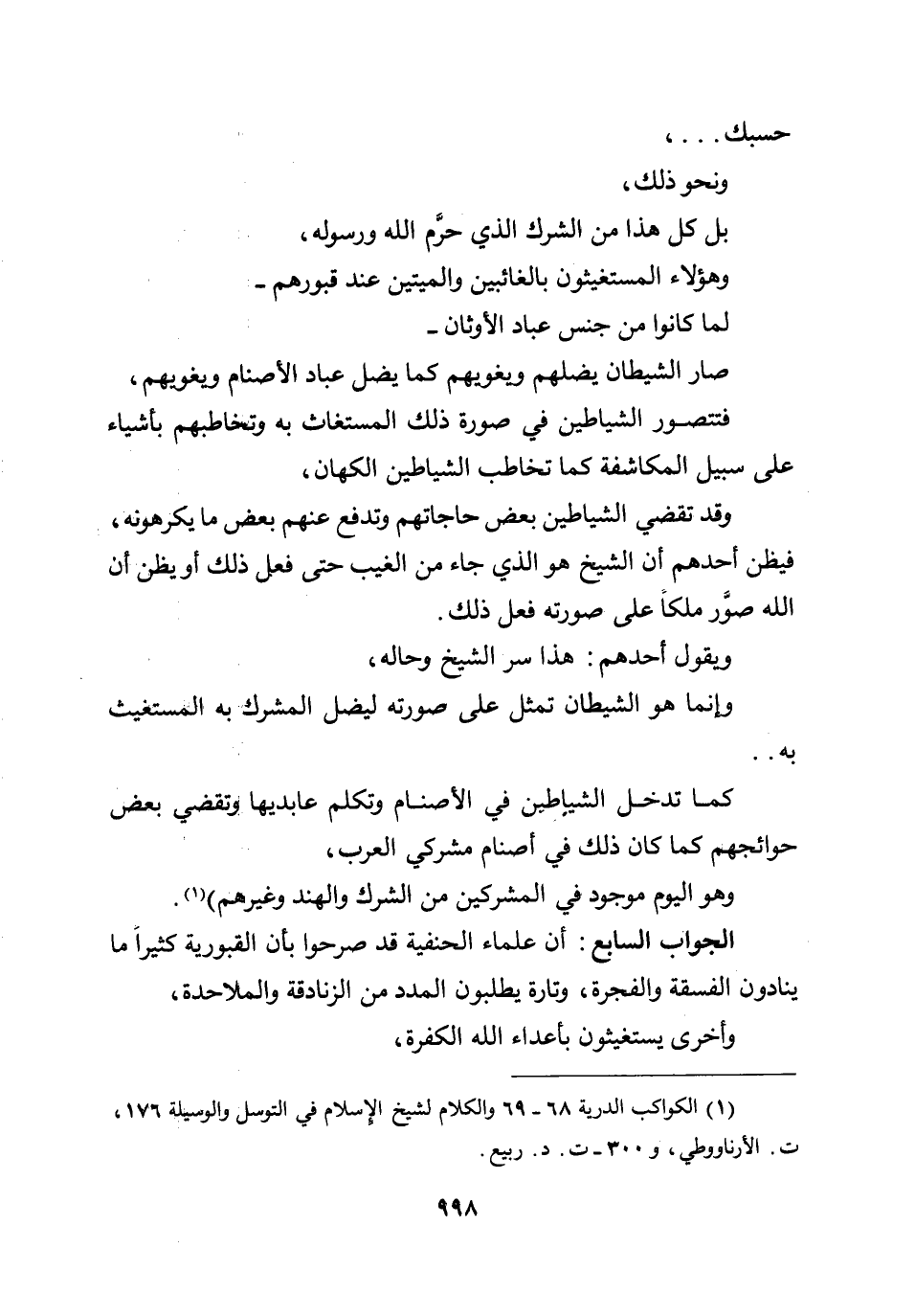 حسبك ... ، ونحو ذلك، بل كل هذا من الشرك الذي حرَّم الله ورسوله، وهؤلاء المستغيثون بالغائبين والميتين عند قبورهم- لما كانوا من جنس عباد الأوثان- صار الشيطان يضلهم ويغويهم كما يضل عباد الأصنام ويغويهم، فتتصور الشياطين في صورة ذلك المستغاث به وتخاطبهم بأشياء على سبيل المكاشفة كما تخاطب الشياطين الكهان، وقد تقضي الشياطين بعض حاجاتهم وتدفع عنهم بعض ما يكرهونه، فيظن أحدهم أن الشيخ هو الذي جاء من الغيب حتى فعل ذلك أو يظن أن الله صوَّر ملكا على صورته فعل ذلك.