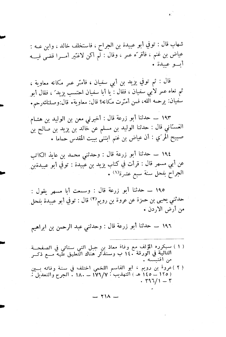 حدثنا أبو زرعة قَالَ: وَسَمِعْتُ أَبَا مُسْهِرٍ يَقُولُ: حَدَّثَنِي يَحْيَى بْنُ حَمْزَةَ عَنِ عُرْوَةَ بْنِ رُوَيْمٍ قَالَ: تُوُفِّيَ أَبُو عُبَيْدَةَ بِفَحْلٍ مِنْ أَرْضِ الأردن.