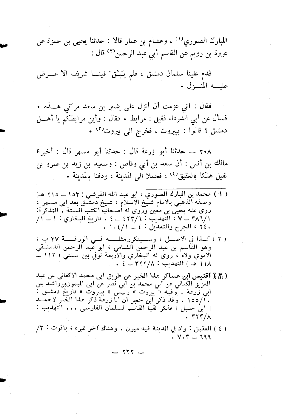 الْمُبَارَكِ الصُّورِيُّ، وَهِشَامُ بْنُ عَمَّارٍ قَالَا: حدثنا يَحْيَى بْنُ حَمْزَةَ عَنْ عُرْوَةَ بْنِ رُوَيْمٍ عَنِ الْقَاسِمِ أَبِي عَبْدِ الرَّحْمَنِ قَالَ: قدم علينا سلمان دمشق، فلم يَبْقَ فِينَا شَرِيفٌ إِلَّا عَرَضَ عَلَيْهِ الْمَنْزِلَ.