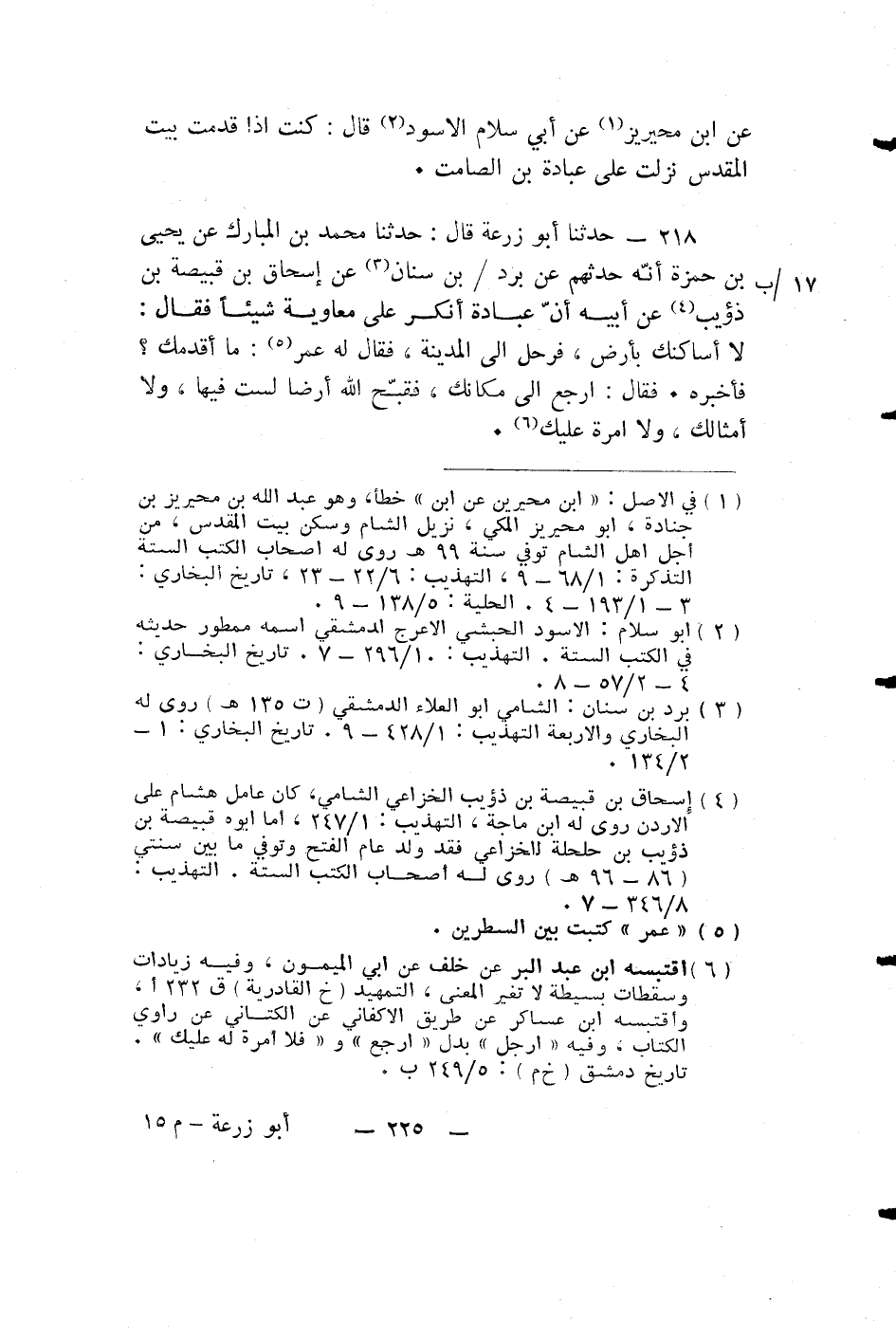 حدثنا أبو زرعة قال: حدثنا مُحَمَّدُ بْنُ الْمُبَارَكِ عَنْ يَحْيَى بْنِ حَمْزَةَ أَنَّهُ حدثهم عن بدر بْنِ سِنَانَ عَنْ إِسْحَاقَ بْنِ قَبِيصَةَ بْنِ ذُؤَيْبٍ عَنْ أَبِيهِ أَنَّ عُبَادَةَ أَنْكَرَ عَلَى مُعَاوِيَةَ شَيْئًا فَقَالَ: لَا أُسَاكِنُكَ بِأَرْضٍ، فَرَحَلَ إِلَى الْمَدِينَةِ، فَقَالَ لَهُ عُمَرُ: مَا أَقْدَمَكَ؟ فَأَخْبَرَهُ. فَقَالَ: ارْجِعْ إِلَى مَكَانِكَ، فَقَبَّحَ اللَّهُ أَرْضًا لَسْتَ فِيهَا، وَلَا أَمْثَالُكَ، ولا أمرة عليك.