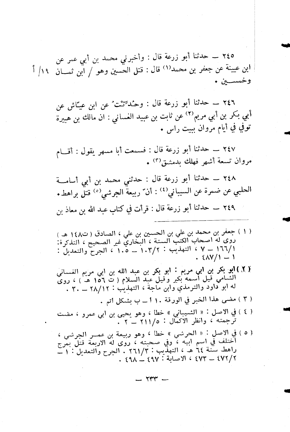 حدثنا أبو زرعة قَالَ: حَدَّثَنِي مُحَمَّدُ بْنُ أَبِي أُسَامَةَ الْحَلَبِيُّ عَنْ ضَمْرَةَ عَنِ السَّيْبَانِيِّ: أَنَّ رَبِيعَةَ الجُرَشِيَّ قُتِلَ براهط.