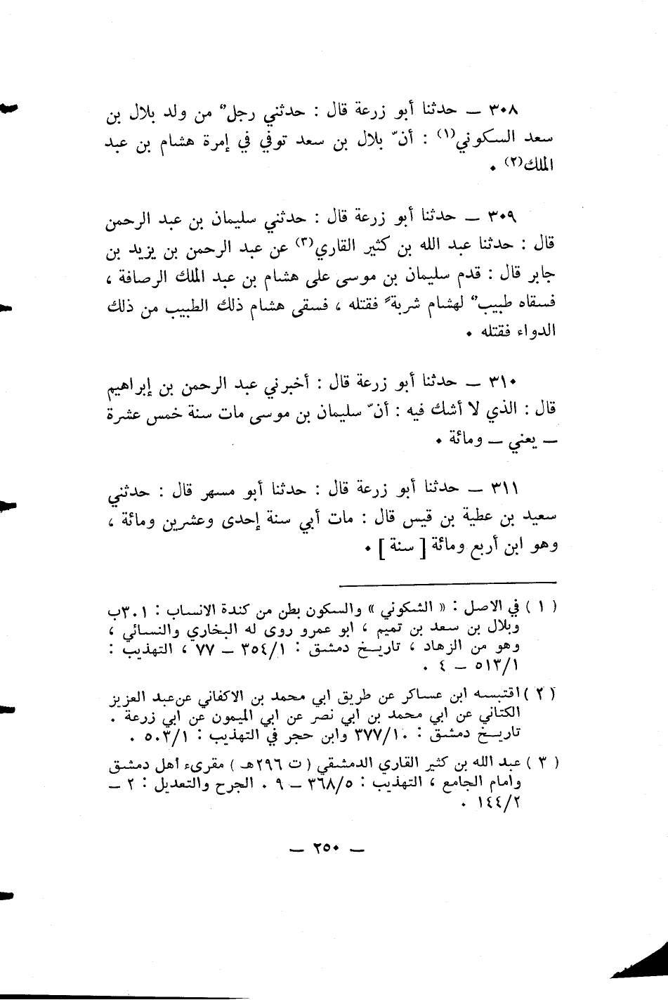 حدثنا أبو زرعة قَالَ: حَدَّثَنِي سُلَيْمَانُ بْنُ عَبْدِ الرَّحْمَنِ قال: حَدَّثَنَا عَبْدُ اللَّهِ بْنُ كَثِيرٍ الْقَارِيُّ عَنْ عَبْدِ الرَّحْمَنِ بْنِ يَزِيدَ بْنِ جَابِرٍ قَالَ: قَدِمَ سُلَيْمَانُ بْنُ مُوسَى عَلَى هِشَامِ بْنِ عَبْدِ الْمَلِكِ الرَّصَافَةَ، فَسَقَاهُ طَبِيبٌ لِهِشَامٍ شُرْبَةً فَقَتَلَهُ، فَسَقَى هِشَامٌ ذَلِكَ الطَّبِيبَ من ذلك الدواء فقتله.