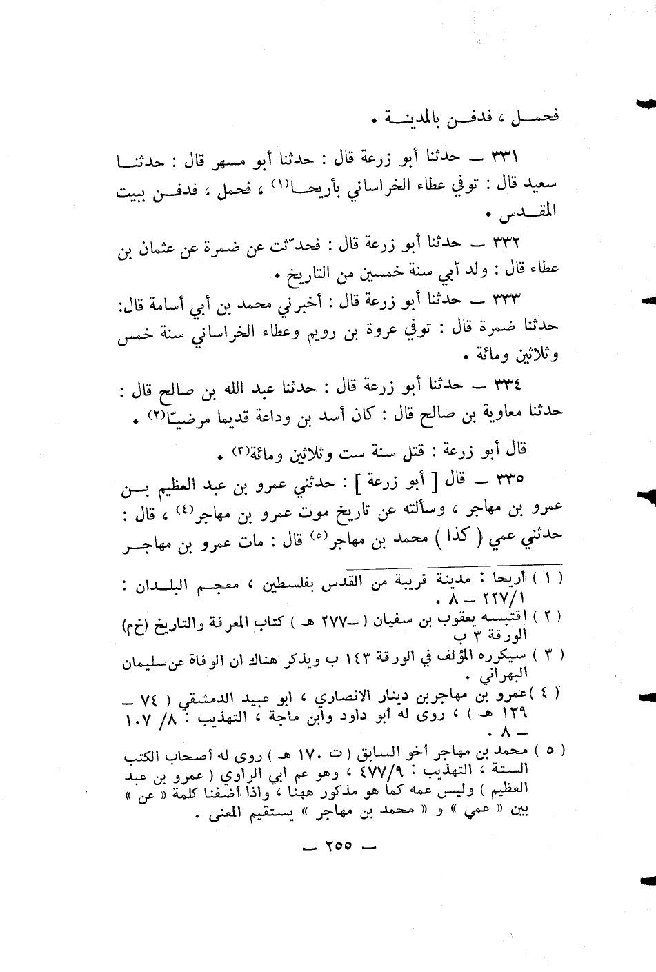 حدثنا أبو زرعة قال: أَخْبَرَنِي مُحَمَّدُ بْنُ أَبِي أُسَامَةَ قال: حَدَّثَنَا ضَمْرَةُ قَالَ: تُوُفِّيَ عُرْوَةُ بْنُ رُوَيْمٍ وَعَطَاءُ الْخُرَاسَانِيُّ سَنَةَ خَمْسٍ وَثَلَاثِينَ وَمِائَةٍ.