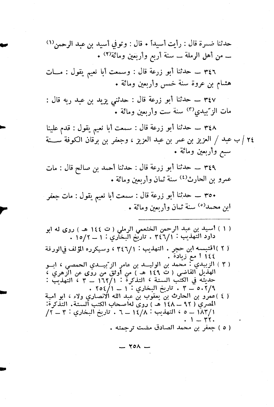 حدثنا أبو زرعة قَالَ: حَدَّثَنِي يَزِيدُ بْنُ عَبْدِ رَبِّهِ قَالَ: مَاتَ الزُّبَيْدِيُّ سَنَةَ ست وأربعين ومائة.
