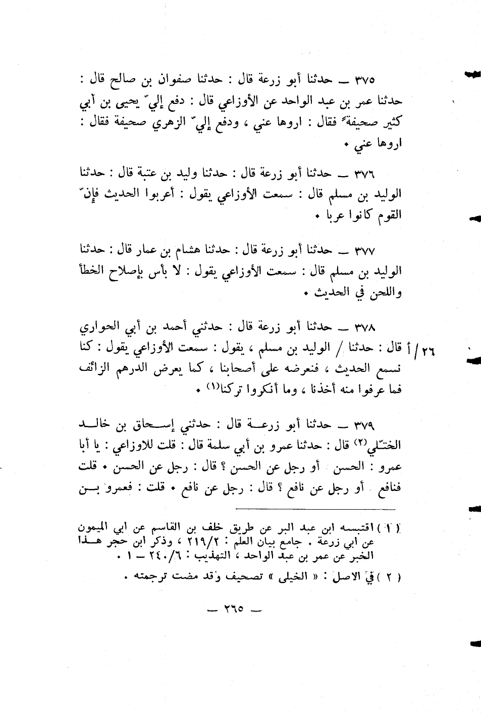 حدثنا أبو زرعة قال: حدثنا هِشَامُ بْنُ عَمَّارٍ قال: حَدَّثَنَا الْوَلِيدُ بْنُ مُسْلِمٍ قَالَ: سَمِعْتُ الْأَوْزَاعِيَّ يَقُولُ: لَا بَأْسَ بِإِصْلَاحِ الْخَطَأِ وَاللَّحْنِ فِي الحديث.