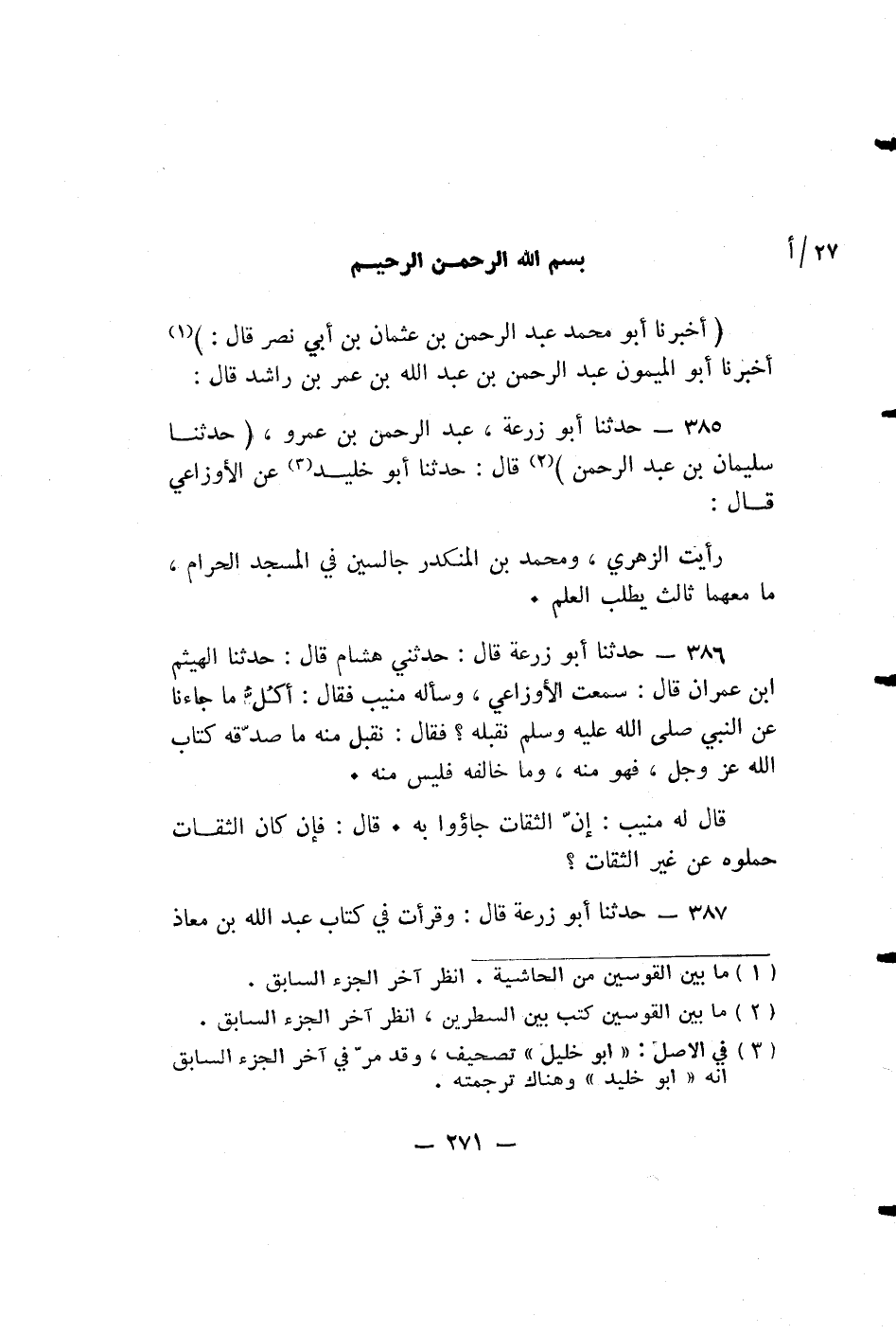 أخبرنا أبو محمد عَبْدُ الرَّحْمَنِ بْنُ عُثْمَانَ بْنِ أبي نصر قال: أخبرنا أبو الميمون عَبْدِ الرَّحْمَنِ بْنِ عَبْدِ اللَّهِ بن عمر بن راشد قال: حدثنا أَبُو زُرْعَةَ: عَبْدُ الرَّحْمَنِ بْنُ عمرو، حدثنا سُلَيْمَانُ بْنُ عَبْدِ الرَّحْمَنِ قال: حديثنا أَبُو خُلَيْدٍ عَنِ الْأَوْزَاعِيِّ قَالَ: رَأَيْتُ الزُّهْرِيَّ، وَمُحَمَّدَ بْنَ الْمُنْكَدِرِ جَالِسَيْنِ فِي الْمَسْجِدِ الْحَرَامِ، مَا معهما ثالث يطلب العلم.