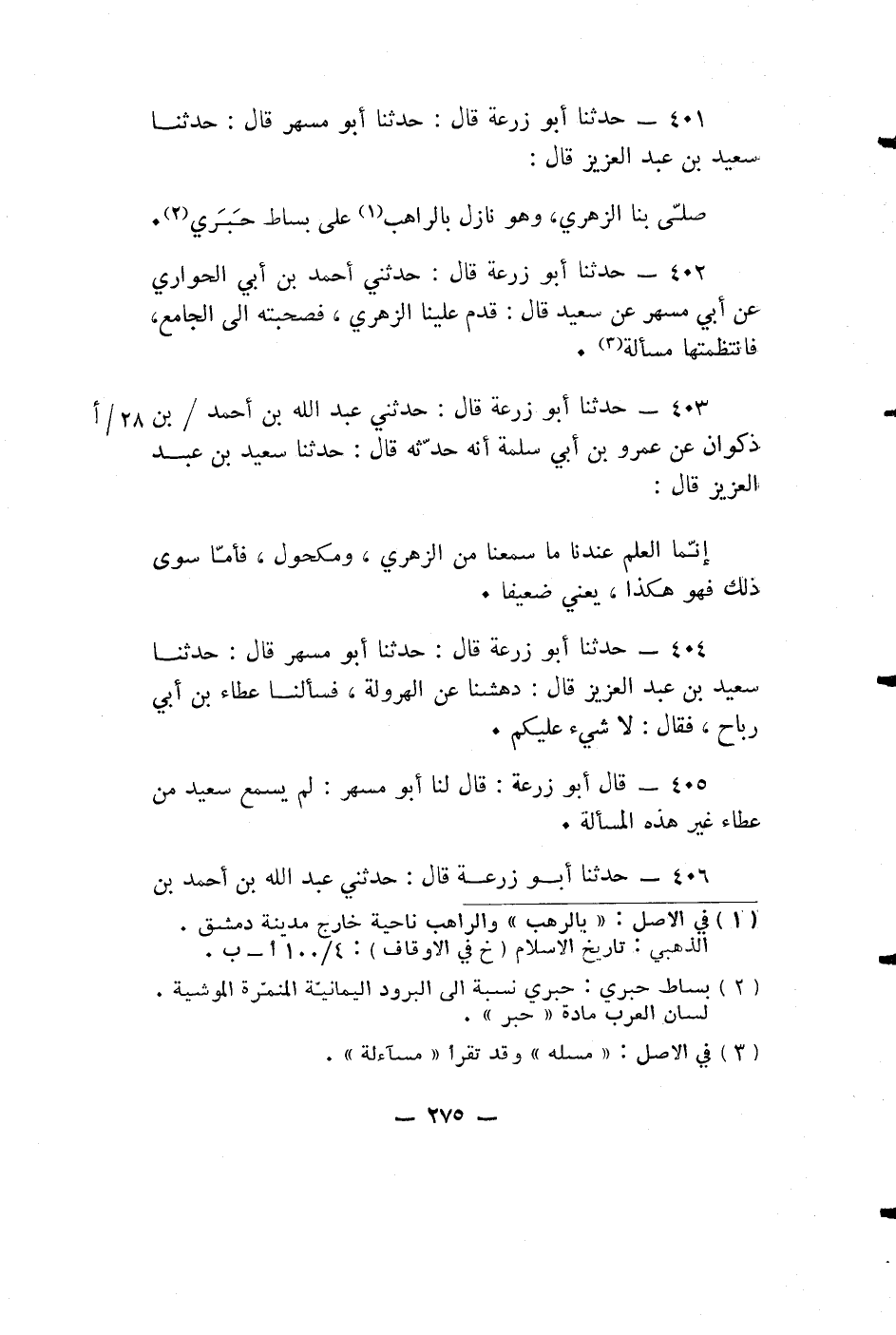 حدثنا أبو زرعة قَالَ: حَدَّثَنَا أَبُو مُسْهِرٍ قَالَ: حَدَّثَنَا سَعِيدُ بْنُ عَبْدِ الْعَزِيزِ قَالَ: صَلَّى بِنَا الزُّهْرِيُّ، وَهُوَ نَازِلٌ بِالرَّاهِبِ عَلَى بُسَاطٍ حَبَرِيٍّ.