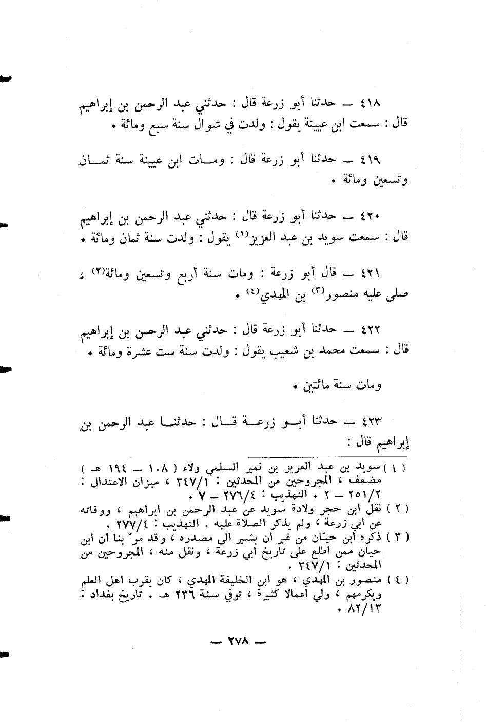 حدثنا أبو زرعة قَالَ: حَدَّثَنِي عَبْدُ الرَّحْمَنِ بْنُ إِبْرَاهِيمَ قال: سَمِعْتُ سُوَيْدَ بْنَ عَبْدِ الْعَزِيزِ يَقُولُ: وُلِدْتُ سَنَةَ ثمان ومائة.