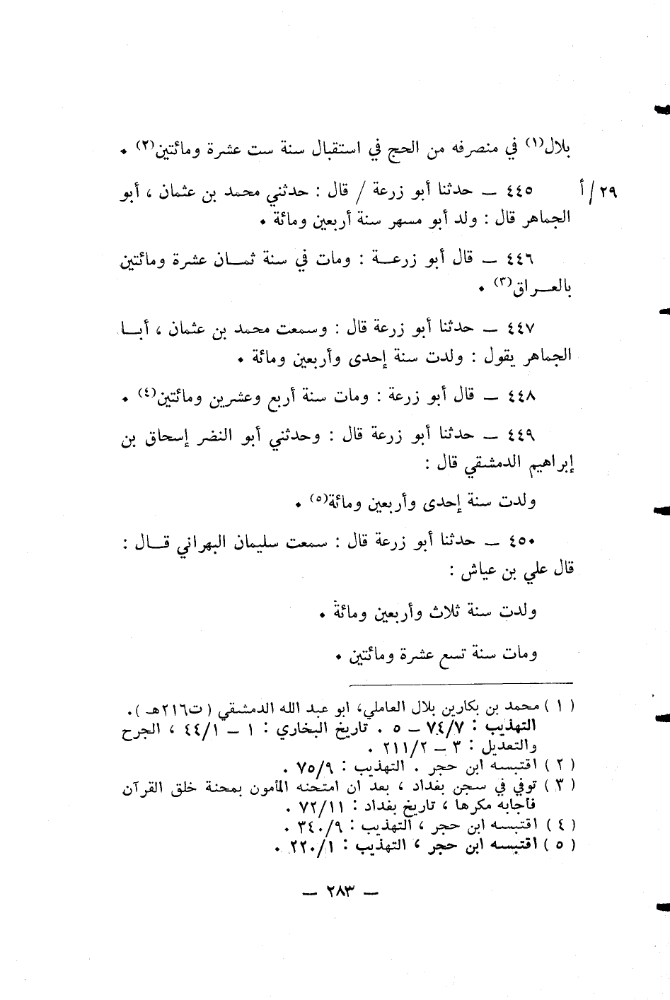 حَدَّثَنَا أَبُو زُرْعَةَ قَالَ: سَمِعْتُ سُلَيْمَانَ الْبَهْرَانِيَّ قَالَ: قَالَ عَلِيُّ بن عياش: وُلِدْتُ سَنَةَ ثَلَاثٍ وَأَرْبَعِينَ وَمِائَةٍ.