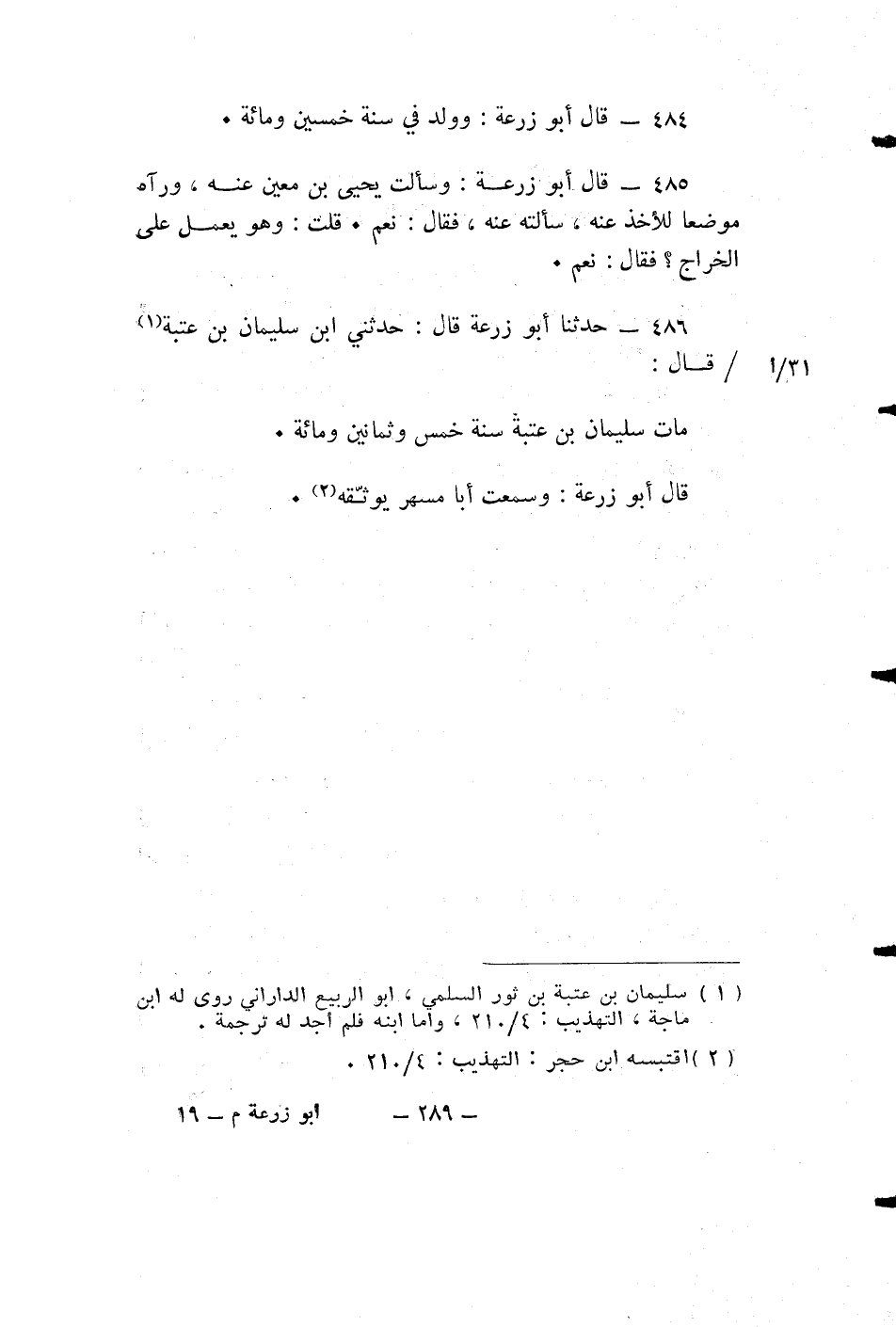 حدثنا أبو زرعة قَالَ: حَدَّثَنِي ابْنُ سُلَيْمَانَ بْنِ عُتْبَةَ قَالَ: مَاتَ سُلَيْمَانُ بْنُ عُتْبَةَ سَنَةَ خَمْسٍ وَثَمانِينَ وَمِائَةٍ.