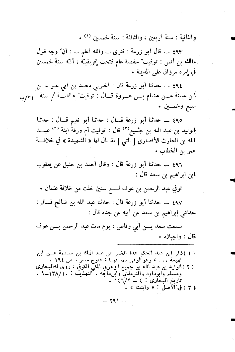 حدثنا أبو زرعة قَالَ: وَقَالَ أَحْمَدُ بْنُ حَنْبَلٍ عَنْ يَعْقُوبَ بْنِ إِبْرَاهِيمَ بْنِ سَعْدٍ قَالَ: تُوُفِّيَ عَبْدُ الرَّحْمَنِ بْنُ عَوْفٍ لِسَبْعِ سِنِينَ خَلَتْ من خلافة عثمان.