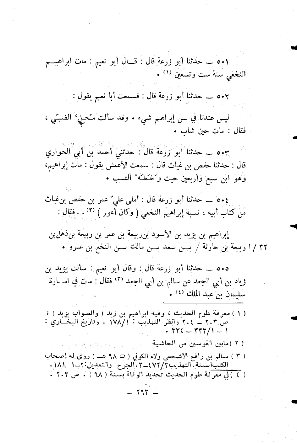 حدثنا أبو زرعة قَالَ: قَالَ أَبُو نُعَيْمٍ: مَاتَ إِبْرَاهِيمُ النَّخْعِيُّ سَنَةَ سِتٍّ وَتِسْعِينَ.