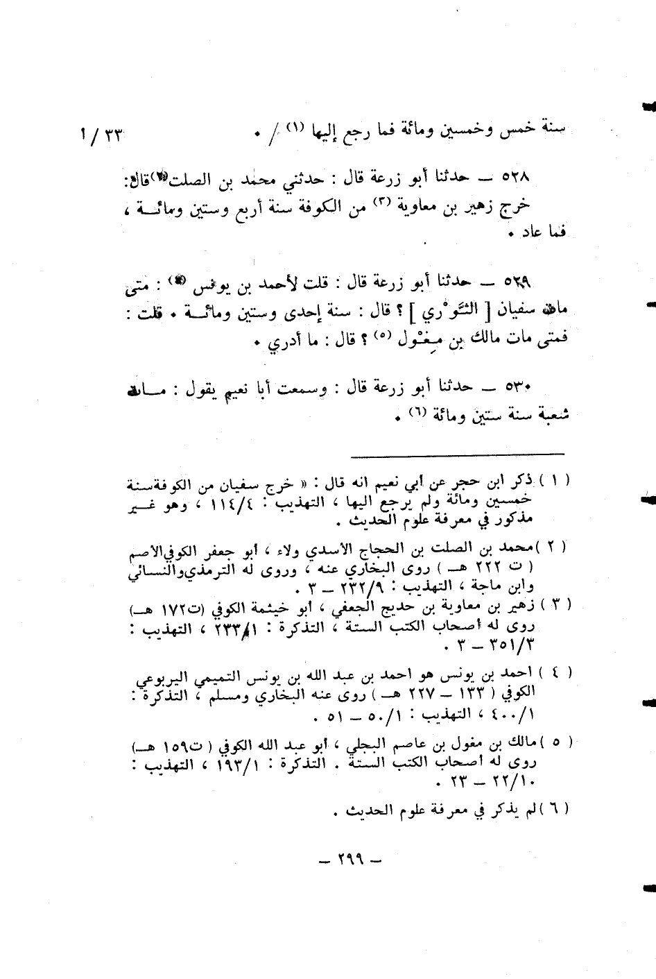 حدثنا أبو زرعة قَالَ: قُلْتُ لِأَحْمَدَ بْنِ يُونُسَ: مَتَى مَاتَ سُفْيَانُ الثَّوْرِيُّ؟ قَالَ: سَنَةَ إِحْدَى وَسِتِّينَ وَمِائَةٍ. قُلْتُ: فَمَتَى مَاتَ مَالِكُ بْنُ مِغْوَلَ؟ قال: ما أدري.