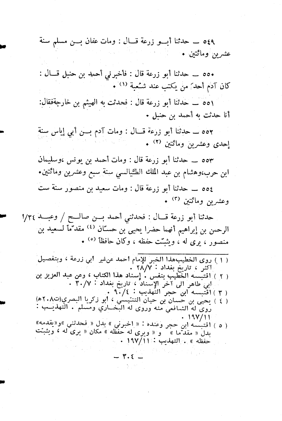 حدثنا أبو زرعة قَالَ: فَحَدَّثْتُ بِهِ الْهَيْثَمَ بْنَ خَارِجَةَ فَقَالَ: أَنَا حَدَّثْتُ بِهِ أحمد بن حنبل.