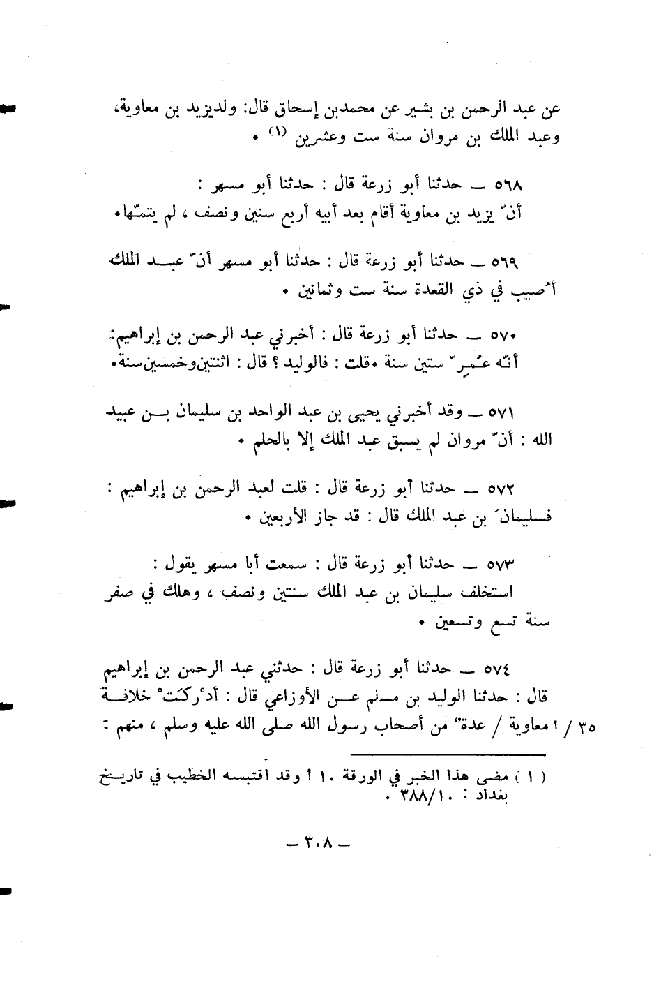 حَدَّثَنَا أَبُو زُرْعَةَ قَالَ: سَمِعْتُ أَبَا مُسْهِرٍ يَقُولُ: اسْتُخْلِفَ سُلَيْمَانُ بْنُ عَبْدِ الْمَلِكِ سَنَتَيْنِ وَنِصْفٍ، وَهَلَكَ فِي صَفَرٍ سَنَةَ تِسْعٍ وتسعين.